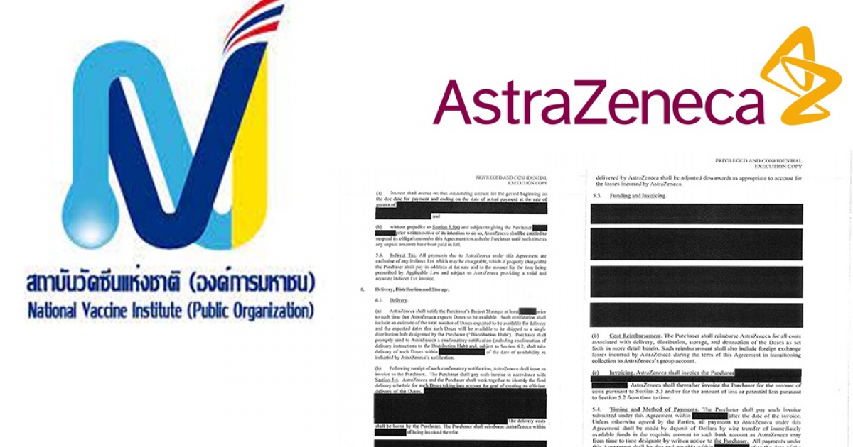 "...ในสัญญาดังกล่าวระบุผู้ซื้อคือ กรมควบคุมโรค และมีการกำหนดรายละเอียดว่าจะจ้างประเทศไทยให้เป็นทั้งผู้ที่ผลิตวัคซีนและกำหนดว่าไทยจะต้องเป็นผู้ที่ซื้อวัคซีนของแอสตร้าเซนเนก้าด้วยเช่นกัน แต่อย่างไรก็ตาม ในรายละเอียดของสัญญานั้นมีบางส่วนของข้อความที่ถูกปกปิด..."
