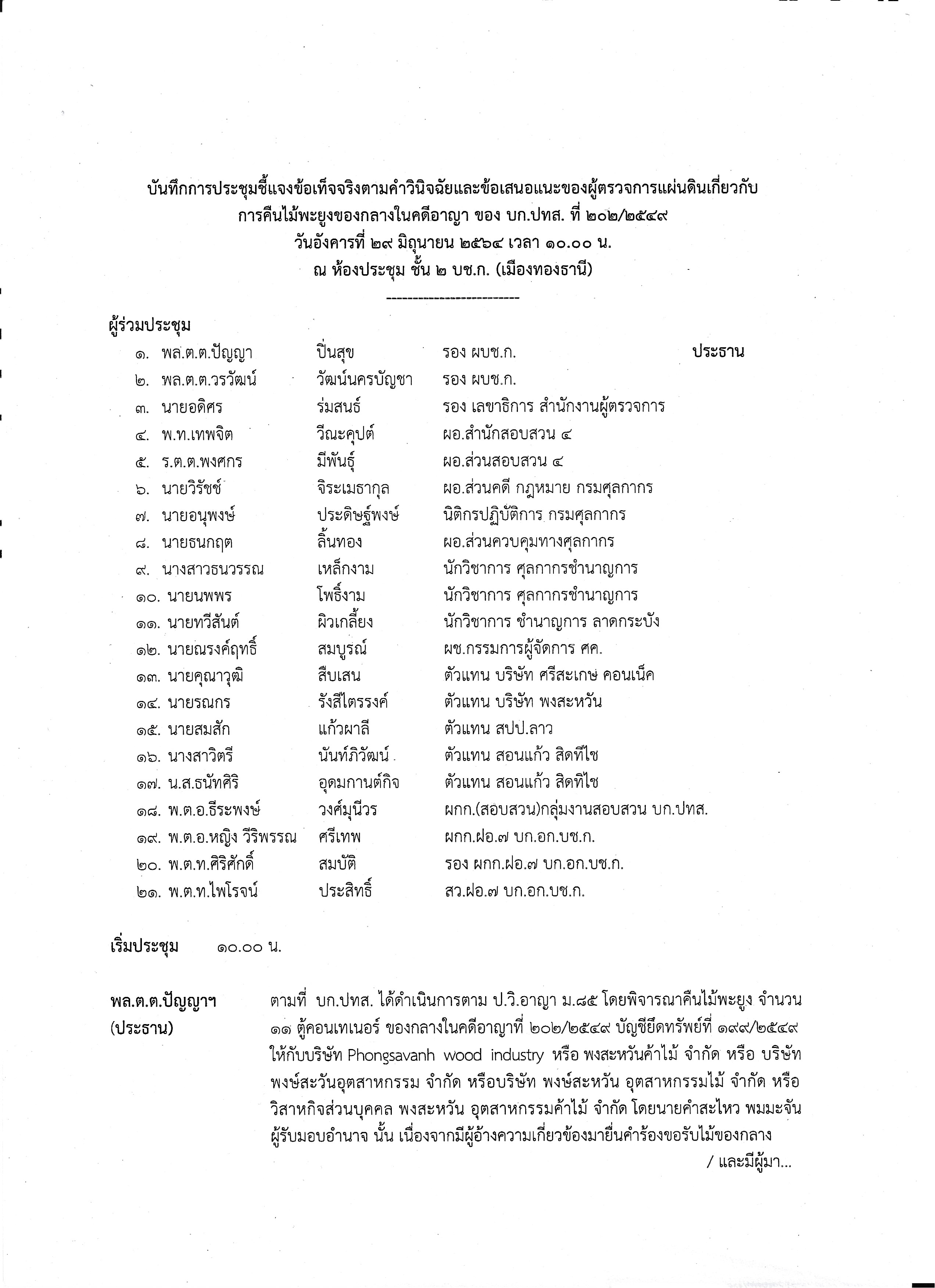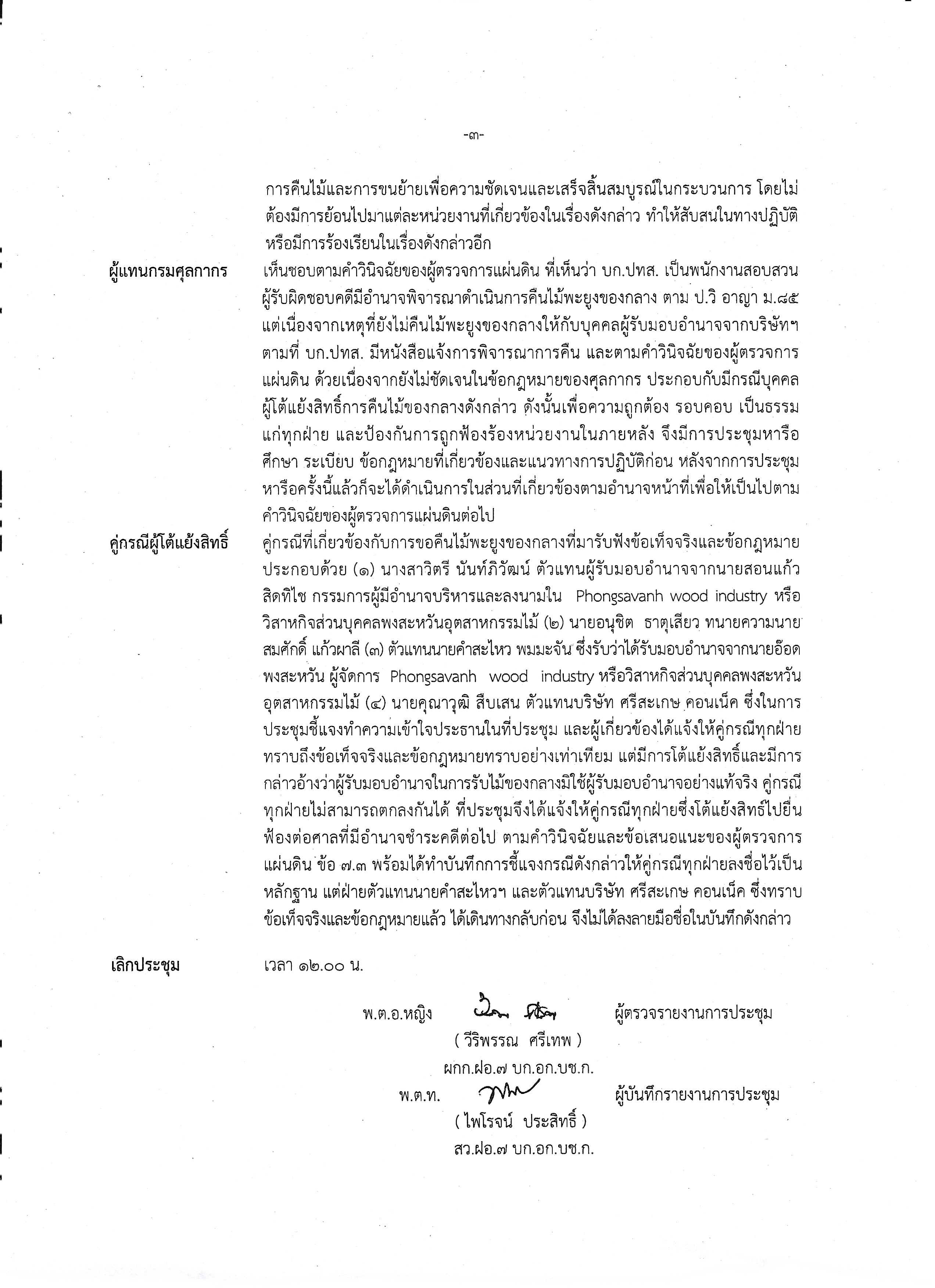 ซึ่งในการประชุมชี้แจงทําความเข้าใจ ประธานในที่ประชุมและผู้เกี่ยวข้องได้แจ้งให้คู่กรณีทุกฝ่าย ทราบถึงข้อเท็จจริงและข้อกฎหมายทราบอย่างเท่าเทียม แต่มีการโต้แย้งสิทธิ์และมีการ กล่าวอ้างว่าผู้รับมอบอํานาจในการรับไม้ของกลางมิใช้ผู้รับมอบอํานาจอย่างแท้จริง คู่กรณี ทุกฝ่ายไม่สามารถตกลงกันได้ ที่ประชุมจึงได้แจ้งให้คู่กรณีทุกฝ่ายซึ่งโต้แย้งสิทธ์ไปยื่น ฟ้องต่อศาลที่มีอํานาจชําระคดีต่อไป ตามคําวินิจฉัยและข้อเสนอแนะของผู้ตรวจการ แผ่นดิน ข้อ 7.3 พร้อมได้ทําบันทึกการชี้แจงกรณีดังกล่าวให้คู่กรณีทุกฝ่ายลงชื่อไว้เป็น หลักฐาน