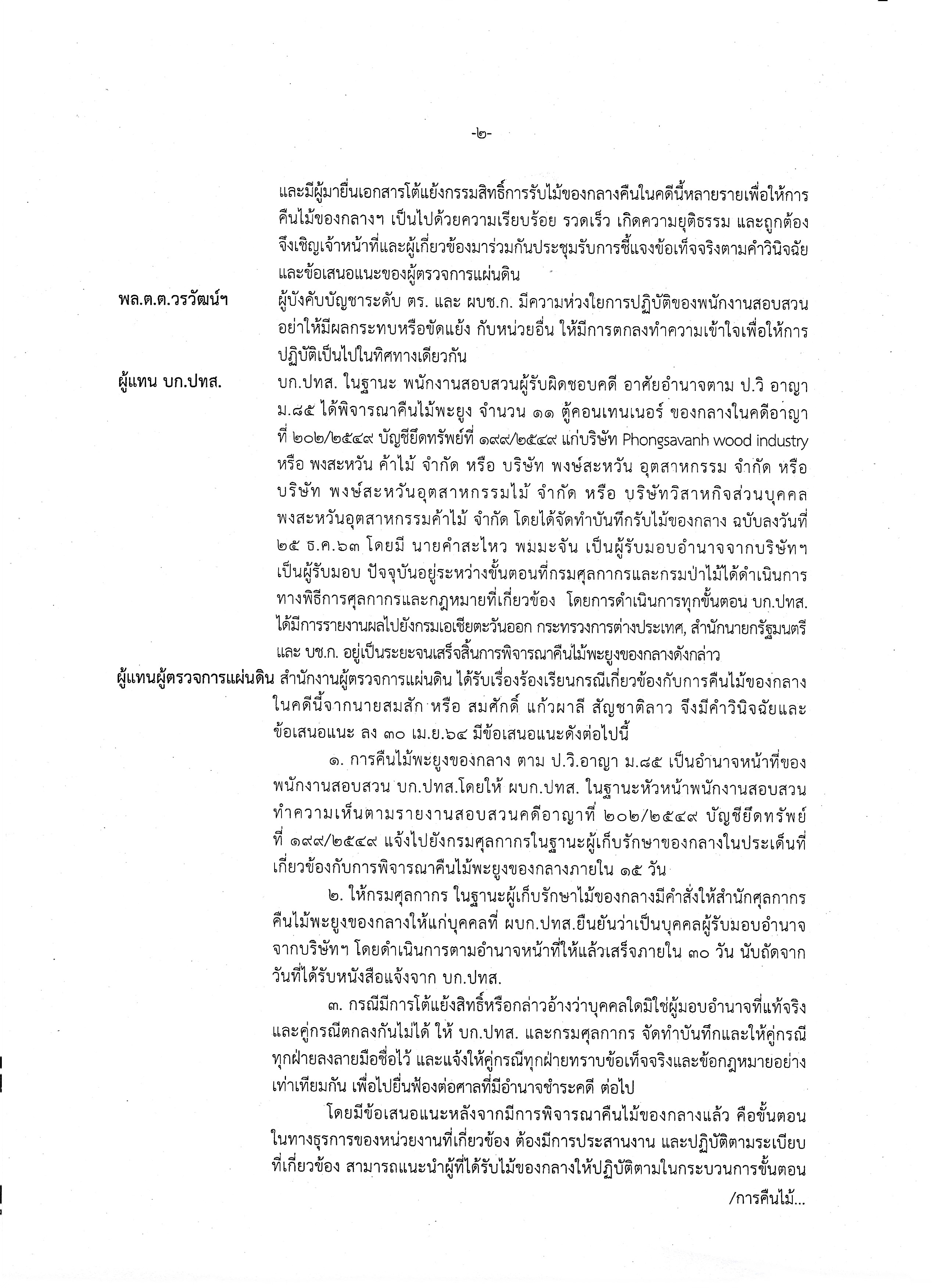 ตามที่ บก.ปทส. ได้ดําเนินการตาม ป.วิ.อาญา ม.45 โดยพิจารณาคืนไม้พะยูง จํานวน 11 ตู้คอนเทเนอร์ ของกลางในคดีอาญาที่ 202/2549 บัญชียึดทรัพย์ที่ 14/2544 ให้กับ บริษัท Phongsavanh Wood industry หรือ พงสะหวันค้าไม้ จํากัด หรือ บริษัท พงษ์สะวันอุตสาหกรรม จํากัด หรือบริษัท พงษ์สะหวัน อุตสาหกรรมไม้ จํากัด หรือ วิสาหกิจส่วนบุคคล พงสะหวัน อุตสาหกรรมค้าไม้ จํากัด โดยนายคําสะไหว พมมะจัน ผู้รับมอบอํานาจ นั้น