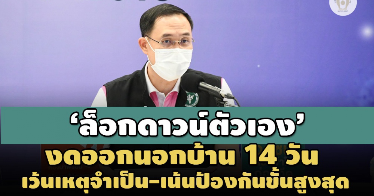 "...มาตรการล็อกดาวน์ งดออกจาก 14 วัน มีข้อยกเว้นในส่วนที่มีความจำเป็น เช่น การออกไปซื้ออาหาร เครื่องใช้ที่จำเป็น ยาหรือเวชภัณฑ์ต่างๆ รวมถึงการออกไปโรงพยาบาล ไปฉีดวัคซีนด้วย และการออกไปเพื่อปฏิบัติติหน้าที่ทางการแพทย์สาธารณสุข และหน้าที่ที่จำเป็นต่อสาธารณะตามมาตรการกำหนด เช่น ตำรวจ ทหาร จิตอาสาที่ต้องเข้ามาช่วยเหลือด้านอาหารสำหรับกลุ่มเปราะบาง เป็นต้น โดยการออกจากบ้าน จำเป็นต้องมีความระมัดระวัง รักษามาตรการป้องกันตนเองอย่างเคร่งครัด เว้นระยะห่าง สวมใส่หน้ากากอนามัยตลอดเวลา พกเจลแอลกอฮอล์ล้างมือตลอดเวลา และขอให้งดการทานอาหารร่วมกัน หรือหากมีความจำเป็น ให้แยกกันทานให้มากที่สุด..."