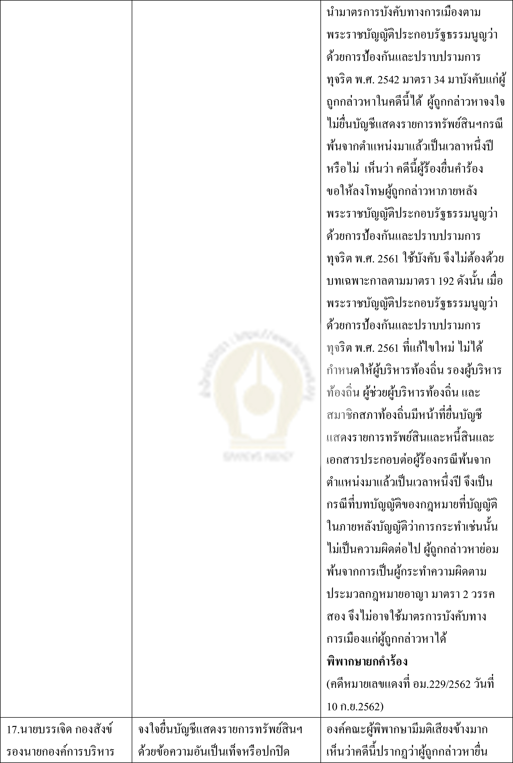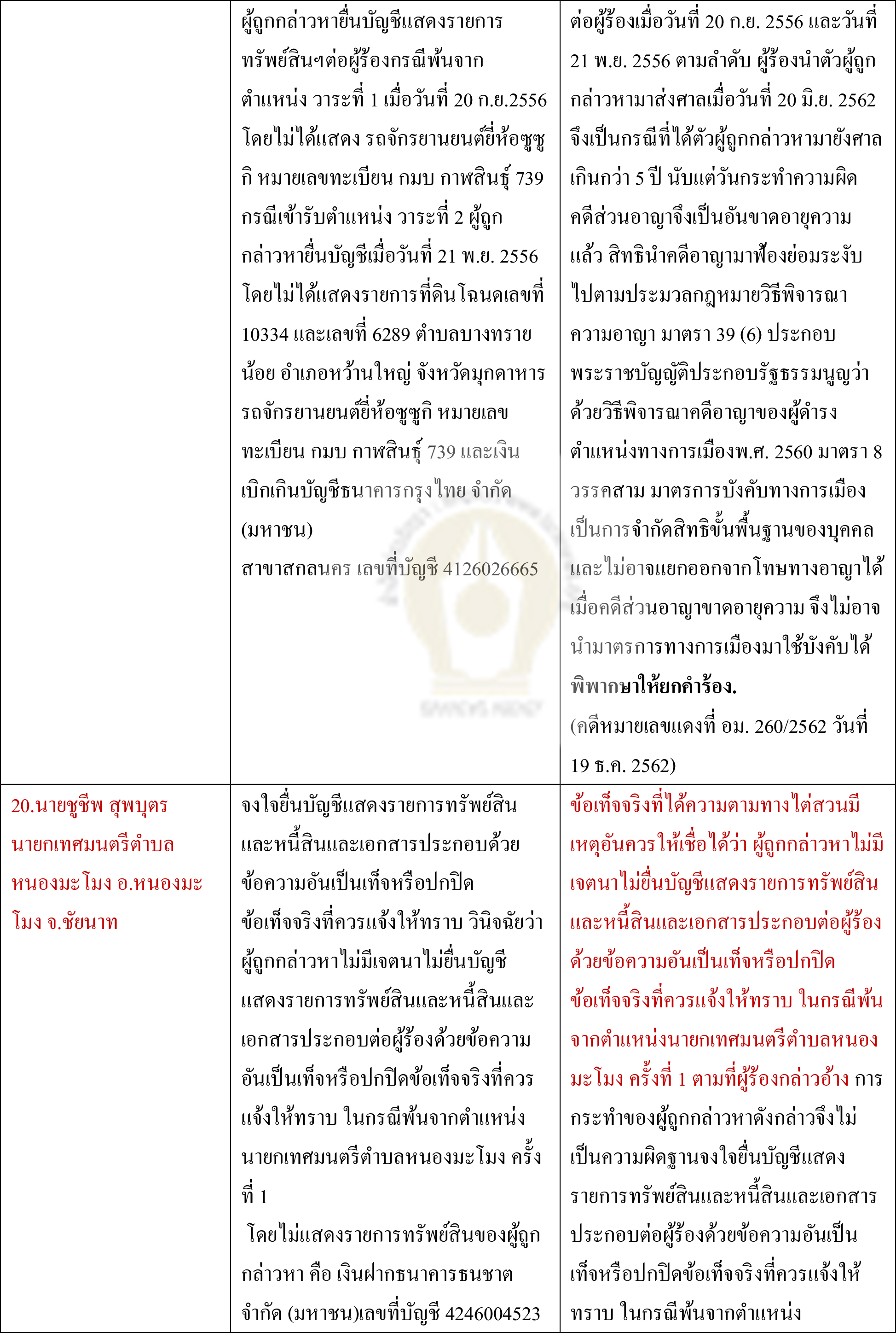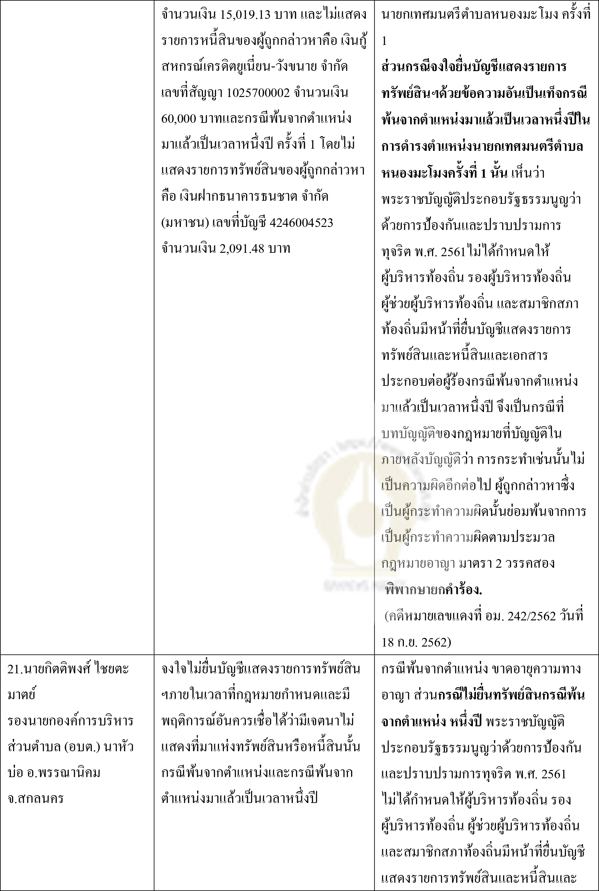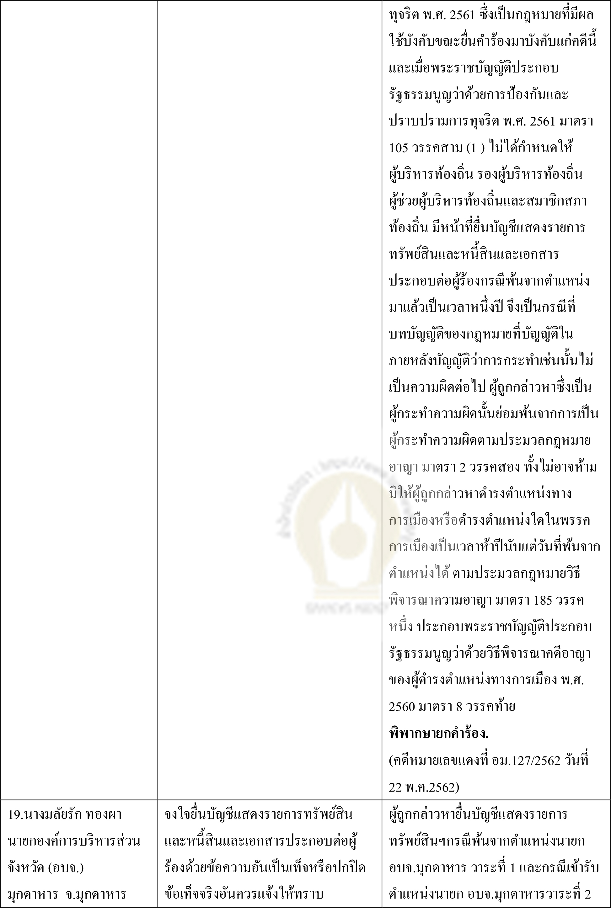 ที่เหลือ 19 รายคดี ขาดอายุความ 5 ปี ,พระราชบัญญัติประกอบรัฐธรรมนูญว่าด้วยการป้องกันและปราบปรามการทุจริต พ.ศ. 2561 ไม่ได้กำหนดให้ตำแหน่งที่ถูกกล่าวหามีหน้าที่ต้องยื่นบัญชีฯ ได้แก่