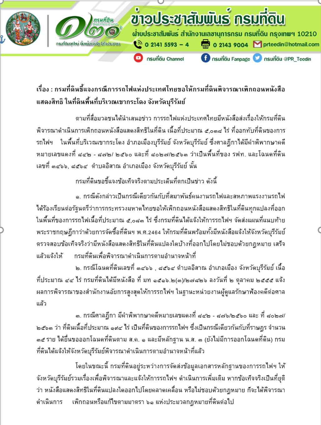 พร้อมทั้ง ‘มีหนังสือแจ้งให้จังหวัดบุรีรัมย์ตรวจสอบข้อเท็จจริงว่า มีหนังสือแสดงสิทธิในที่ดินแปลงใดบ้างที่ออกไปโดยไม่ชอบด้วยกฎหมาย เสร็จแล้วแจ้งให้กรมที่ดินเพื่อพิจารณาดำเนินการตามอำนาจหน้าที่’