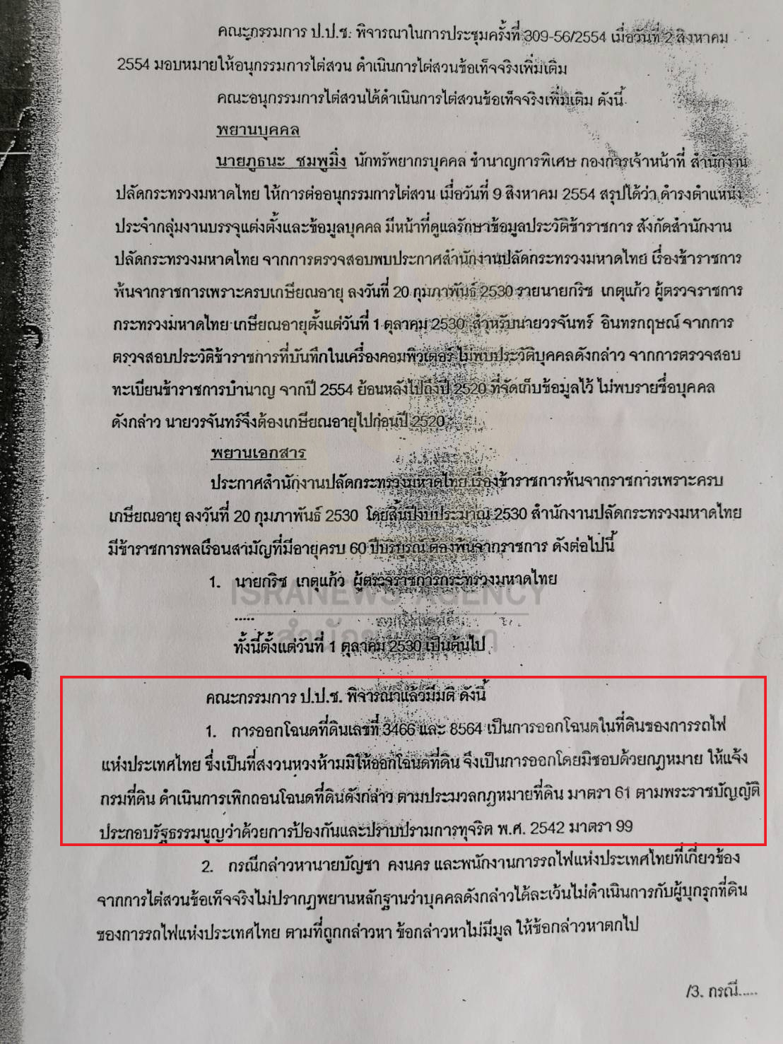 ซึ่งแม้ว่าสำนวนการไต่สวนข้อเท็จจริง คณะกรรมการป้องกันและปราบปรามการทุจริตแห่งชาติ (ป.ป.ช.) เรื่องกล่าวหาเลขที่ดำที่ 51910034 เรื่องกล่าวหาเลขที่แดงที่ 14959054 เมื่อเดือน ก.ย.2554 มีมติชัดเจนว่า การออกโฉนดที่ดินทั้ง 2 แปลงดังกล่าว เป็นการออกโฉนดในที่ดินของ รฟท.