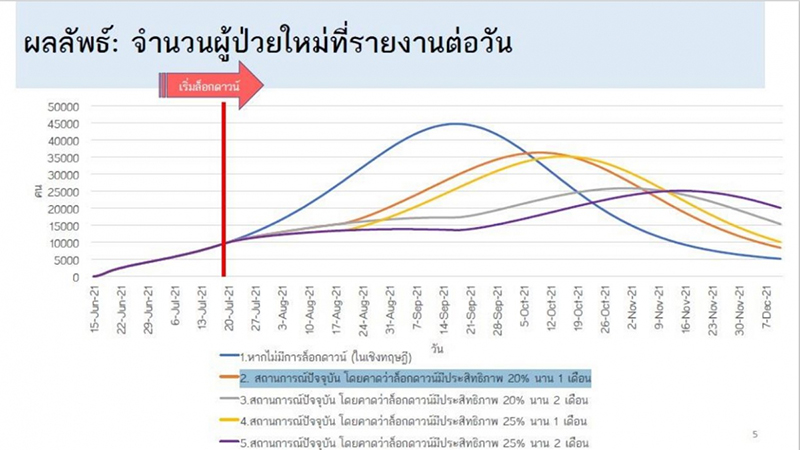 "หากใช้มาตรการล็อกดาวน์นานกว่านี้ หรือมีประสิทธิภาพมากกว่านี้ จะเป็นโมเดลเส้นกราฟสีเหลือง หากทุกคนให้ความร่วมมือมาตรการต่างๆ ลดติดเชื้อได้ 25% นาน 1 เดือนก็จะใกล้เคียงกันกับสีส้ม ถัดมาเป็นเส้นสีเทา หากล็อกดาวน์นาน 2 เดือนและมีประสิทธิภาพ 20% จะทำให้สถานการณ์ผู้ติดเชื้อรายใหม่ลดลงเหลือ 2 หมื่นกว่าราย จาก 4 หมื่นกว่ารายหากไม่ทำอะไรเลย" นพ.โอภาส กล่าว