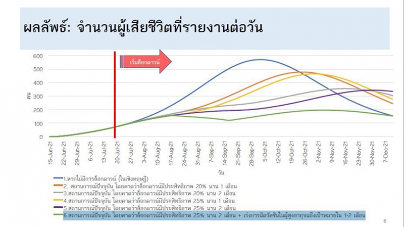 นพ.โอภาส กล่าวถึงการคาดการณ์ผู้เสียชีวิตต่อวัน ว่า หากไม่มีมาตรการล็อกดาวน์หรือไม่มีมาตรการอื่นๆ จะพบว่า เส้นสีน้ำเงิน แสดงถึงมีผู้เสียชีวิตมากกว่า 500 คนต่อวัน จุดสูงสุดประมาณวันที่ 28 ก.ย. แต่หากมีมาตรการล็อกดาวน์ปลายเดือน ก.ค.จะเป็นเส้นสีส้มและสีเหลือง ตัวเลขผู้เสียชีวิตไม่เกิน 400 รายต่อวัน จุดสูงสุดอยู่ที่ 26 ต.ค. ในมาตรการตั้งแต่ 20-25%