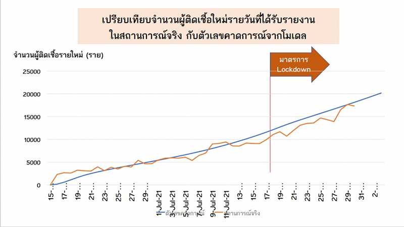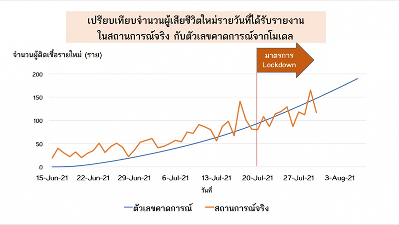 นพ.โอภาส การย์กวินพงศ์ อธิบดีกรมควบคุมโรค กล่าวถึงการคาดการณ์สถานการณ์โควิดตามแบบจำลองทางคณิตศาสตร์ SEIR ว่า เส้นสีน้ำเงินแสดงถึงยอดตัวเลขการคาดการณ์ ส่วนเส้นสีส้มหรือสีแดง เป็นตัวเลขจากสถานการณ์จริง เมื่อนำเส้นกราฟทั้ง 2 มาเปรีบเทียบ และใช้สูตรคำนวณ พบว่าใกล้เคียงกัน และจุดหมายที่ใช้เปรียบเทียบคือ หลังมีการใช้มาตรการล็อกดาวน์เหตุการณ์จะเป็นอย่างไร โดยมีทั้งจำนวนผู้ติดเชื้อรายใหม่ และผู้เสียชีวิต เปรียบเทียบทั้งโมเดล และสถานการณ์จริง เทียบเคียงมาตรการล็อกดาวน์เมื่อปลายเดือน ก.ค.2564 นำมาเปรียบเทียบเพื่อวิเคราะห์สถานการณ์ข้างหน้า