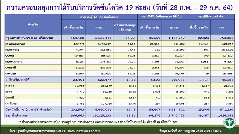 นพ.เกียรติภูมิ กล่าวถึงสถานการณ์การฉีดวัคซีนในปัจจุบันว่า มีการฉีดไปแล้ว 17,011,477 โดส แบ่งเป็นเข็มแรก 13,225,233 โดส และเข็มที่ 2 จำนวน 3,786,244 โดส โดยในพื้นที่ กทม.และปริมณฑล มีการฉีดครอบคลุม 44.20% แต่ในพื้นที่กทม.เพียงที่เดียว ครอบคลุมแล้ว 61% โดยผู้สูงอายุ ใน กทม.มีการฉีดแล้วถึง 70% ส่วนต่างจังหวัดมีการฉีด 12.43% เพราะวัคซีนมีจำนวนจำกัด จะต้องเกลี่ยมาใช้ในพื้นที่ กทม. ที่มีการแพร่ระบาดหนัก