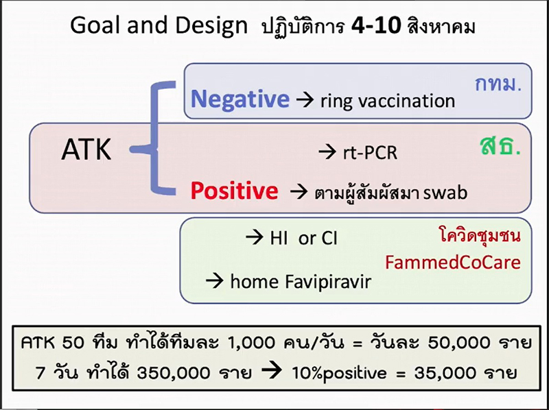 ด้าน นพ.ยงยศ ธรรมวุฒิ รองปลัดกระทรวงสาธารณสุข กล่าวว่า ในช่วง 2 สัปดาห์ที่ผ่านมา ปลัดกระทรวงสาธารณสุขได้ผลักดันเรื่องสำคัญ 4 ข้อ ได้แก่ 1) การใช้ ATK ตรวจหาผู้ติดเชื้อ 2) การทำการแยกตัวที่บ้าน และการแยกกักในชุมชน และจัดทีม CCRT 3) นำวัคซีนโควิดไปฉีดตามชุมชนหรือบ้านของประชาชนโดยทีมเชิงรุก CCRT และ 4) การให้ยาในผู้ป่วยติดเชื้อไม่มีอาการ (Home Favipiravir) หรือเป็นกลุ่มเสี่ยงที่จะป่วยหนักให้เร็วขึ้น โดยส่งถึงผู้ป่วยที่ทำ Home Isolation ไปแล้วจำนวนมาก