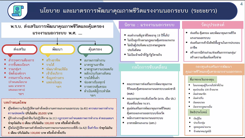 นายนาวิน กล่าวด้วยว่า กระทรวงแรงงานได้มีการผลักดัน พ.ร.บ.ส่งเสริมการพัฒนาคุณภาพชีวิตและคุ้มครองแรงงานนอกระบบ พ.ศ. .... ซึ่งประสบปัญหาวิกฤติโควิดขึ้นมาเสียก่อน ทำให้การดำเนินการยังไม่เสร็จลุล่วง แต่ทั้งนี้ก็ยังมีการผลักดันกันต่อไป มีหลักการสำคัญคือ การส่งเสริม โดยสำรวจความต้องการ การขึ้นทะเบียน การรวมกลุ่มต่างๆ การพัฒนา ด้านการสร้างอาชีพ รายได้ พัฒนาทักษะฝีมือ และการเข้าถึงแหล่งเงินทุน รวมถึงการให้ความคุ้มครอง เช่น มาตรฐานอาชีพ สภาพการทำงาน เป็นต้น