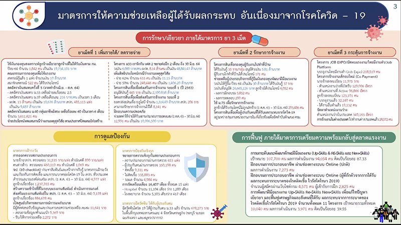 นายนาวิน ธาราแสวง ผู้อำนวยการสำนักนโยบายแรงงานนอกระบบ สำนักงานปลัดกระทรวงแรงงาน กล่าวถึงแนวทางการรับมือต่อสถานการณ์โควิดว่า กระทรวงแรงงานได้มีมาตรการให้ความช่วยเหลือ ประกอบด้วย การจัดตั้งศูนย์ปฏิบัติการรองรับสถานการณ์การว่างงาน จัดตั้งศูนย์ปฏิบัติการรองรับสถานการณ์การแพร่ระบาดของโควิด และให้บริการสายด่วนเพื่อรับเรื่องร้องเรียนและตอบคำถามเกี่ยวกับโควิด