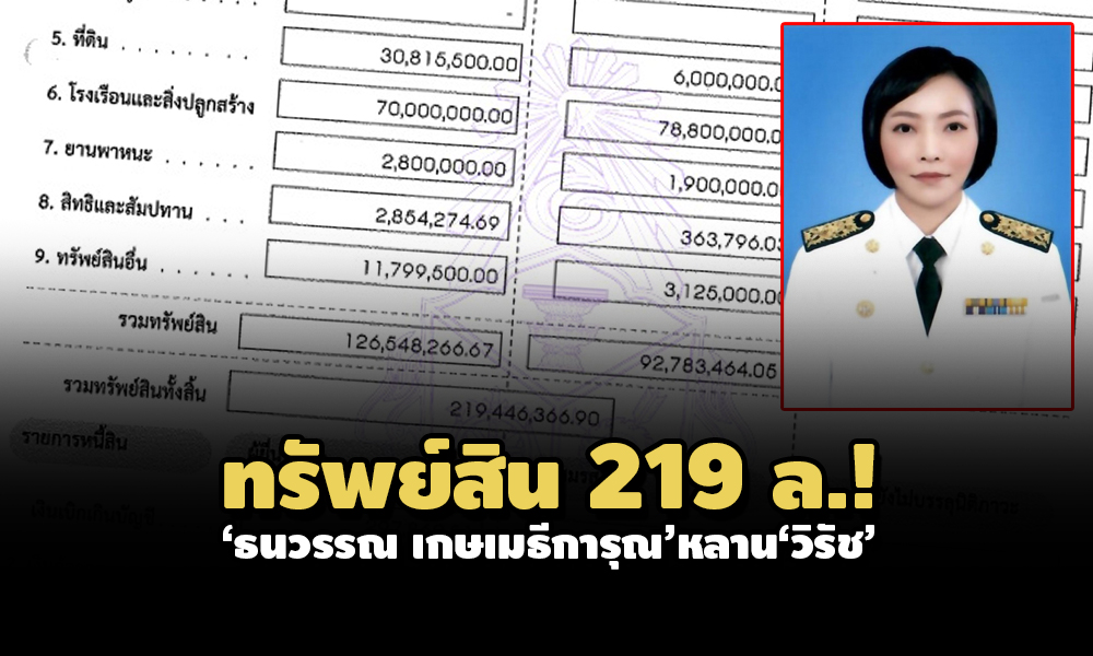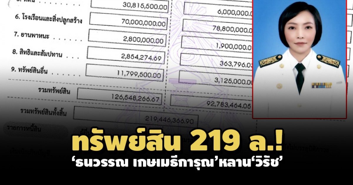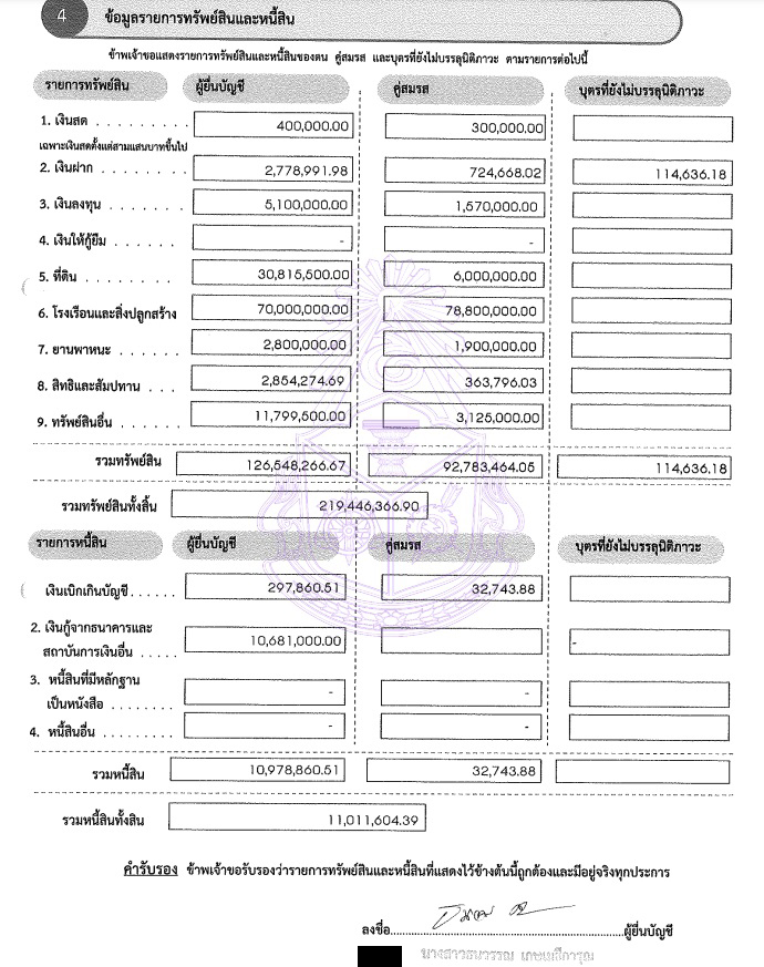รวมทั้งคู่มีทรัพย์สินทั้งสิ้น 219,446,366 บาท มีหนี้สินทั้งสิ้น 11,011,604 บาท