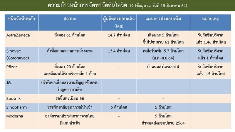 "...แอสตร้าเซนเนก้า ปัจจุบัน ส่งมอบแล้ว 14.7 ล้านโดส รับบริจาค 1.46 ล้านโดส รวม 16.16 ล้านโดส ทั้งนี้ ไทยได้สั่งจองแล้ว 61 ล้านโดส มีแผนส่งมอบเพิ่มเดือนละ 5 ล้านโดสขึ้นไปจนครบ 61 ล้านโดส ซิโนแวค ปัจจุบัน รับมอบมาแล้ว 13.4 ล้านโดส รับบริจาค 1 ล้านโดส รวม 14.4 ล้านโดส ทั้งนี้ ไทยสั่งซื้อตามสถานการณ์ และอยู่ระหว่างรับเพิ่มอีก 5.7 ล้านโดสในเดือน ส.ค.-ก.ย.2564 ไฟเซอร์ ปัจจุบัน ได้รับบริจาค 1.5 ล้านโดส ทั้งนี้ ไทยสั่งจองแล้ว 20 ล้านโดส มีกำหนดส่งช่วงไตรมาส 4 ปี 2564 และมีแผนได้รับบริจาคอีก 1 ล้านโดส..."