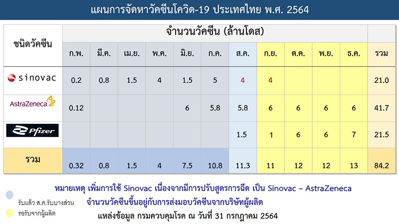 ทั้งนี้มีรายงานด้วยว่าข้อมูลจนถึง 31 ก.ค.2564 ไทยมีแผนจัดหาวัคซีน รวม 84.2 ล้านโดส โดยเป็นที่น่าสนใจว่า ตั้งแต่ ส.ค. - ธ.ค. ยังคาดว่าจะมีวัคซีนเข้ามาตั้งแต่ 11 - 13 ล้านโดส โดยมีรายละเอียด คือ