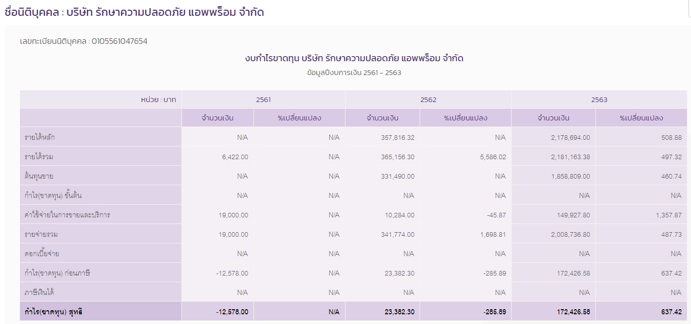 1.บริษัท รักษาความปลอดภัย แอพพร็อม จำกัด จดทะเบียนเมื่อวันที่ 14 มี.ค. 2561 ทุนปัจจุบัน 1 ล้านบาท ตั้งอยู่ที่ 59/23 ชั้นที่ 3 หมู่ที่ 2 ถนนรัตนาธิเบศร์ ต.บางรักพัฒนา อ.บางบัวทอง จ.นนทบุรี วัตถุประสงค์ที่ส่งงบการเงินปีล่าสุด รักษาความปลอดภัย