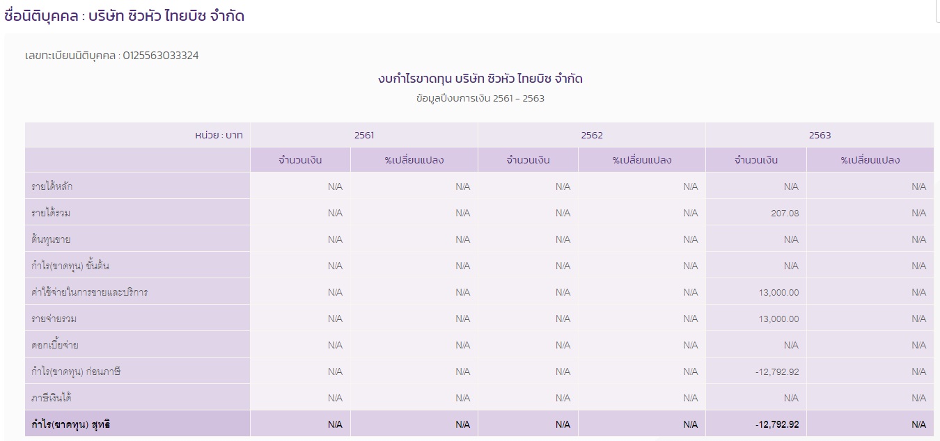 นำส่งงบการเงินล่าสุดเมื่อปี 2563 มีรายได้รวม 207 บาท รายจ่ายรวม 13,000 บาท ขาดทุนสุทธิ 12,792 บาท