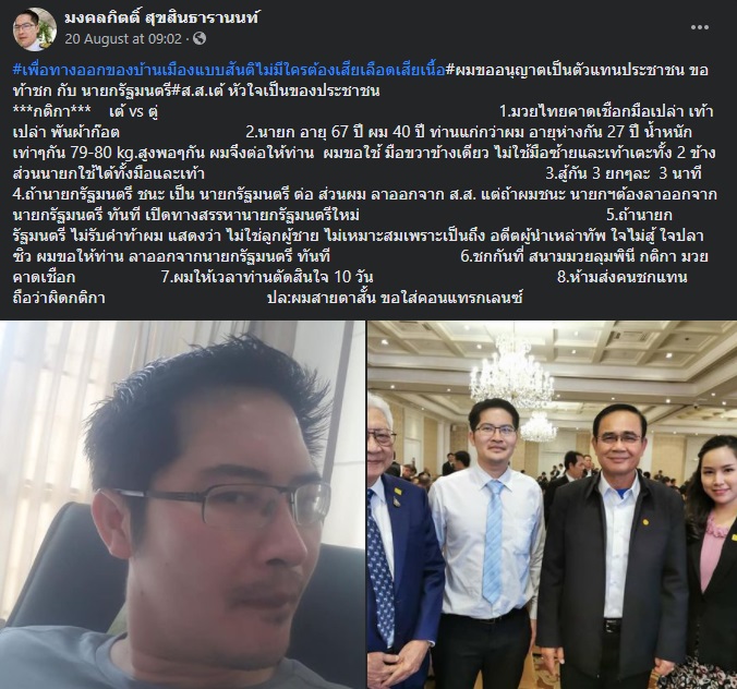 ล่าสุด ออกมาเปิดหน้า ‘ท้าชก’ นายกรัฐมนตรี พล.อ.ประยุทธ์ จันทร์โอชา ผ่านทางสื่อสังคมออนไลน์ ส่งผลให้เกิดกระแสวิพากษ์วิจารณ์อย่างกว้างขวางว่า เหตุใดเป็นถึง ส.ส. ไม่ใช้หนทางตามสภาฯ และตามรัฐธรรมนูญ แต่กลับใช้ ‘กำลัง’ แก้ไขปัญหา บางส่วนออกโรงปกป้องนายกรัฐมนตรี ขอขึ้นท้าชกกับนายมงคลกิตติ์แทน?