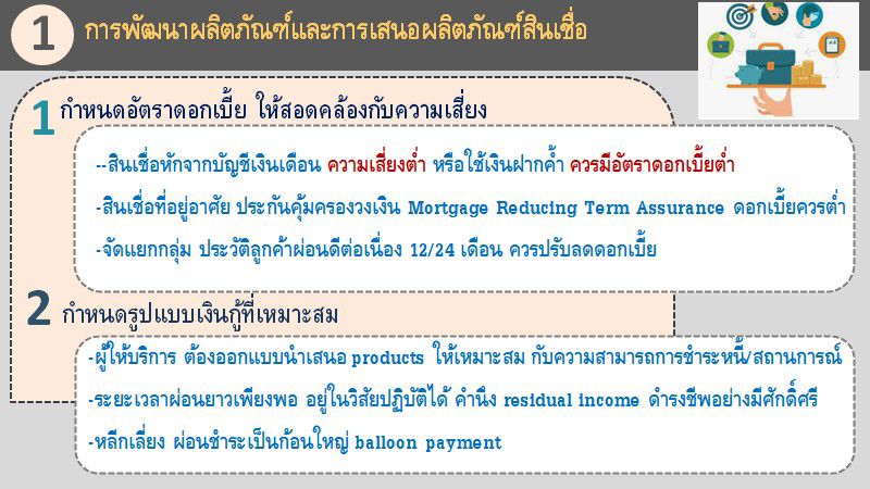 1.แนวทางการกำหนดอัตราดอกเบี้ยให้สอดคล้องกับความเสี่ยง ได้แก่ สินเชื่อที่หักจากเงินเดือน ‘ความเสี่ยงต่ำ’ หรือใช้เงินฝากค้ำประกัน ควรมีอัตราดอกเบี้ยต่ำ, สินเชื่อที่อยู่อาศัย, ประกันคุ้มครองวงเงิน MRTA (Mortgage Reducing Term Assurance อัตราดอกเบี้ยควรต่ำ และลูกหนี้ที่มีประวัติผ่อนดีต่อเนื่อง 12 หรือ 24 เดือน ควรปรับลดอัตราดอกเบี้ย