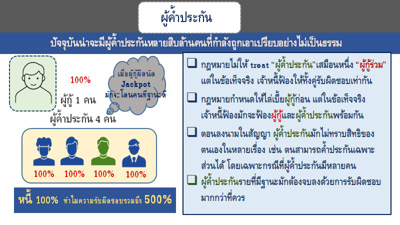 “เรื่องผู้ค้ำประกัน ถ้าเขาไม่ได้ประโยชน์อะไรเลยจากสินเชื่อ ไม่ได้เงิน ก็ไม่ควรถูกบังคับให้เป็นผู้กู้ร่วมหรือลูกหนี้ร่วม ซึ่งปัจจุบันมีตัวอย่างให้เห็นเยอะ และถ้าเขามาค้ำประกันกันหลายคน ก็ควรแบ่งการชำระหนี้ตามสัดส่วน ไม่ใช่ว่าบังคับเอาหนี้กันทั้งวง และการไล่เบี้ยก็เช่นกัน กฎหมายพูดว่าให้ไปไล่เบี้ยผู้กู้ก่อน แต่เจ้าหนี้ไปฟ้องพร้อมกันเลย