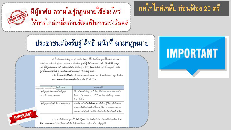 อย่างไรก็ตาม ในการไกล่เกลี่ยหนี้นั้น เนื่องจากที่ผ่านมามีผู้อาศัยความไม่รู้กฎหมายของลูกหนี้มาเป็นช่องโหว่ โดยใช้การ ‘ไกล่เกลี่ยก่อนฟ้อง’ ตามมาตรา 20 ตรี แห่งประมวลกฎหมายวิธีพิจารณาความแพ่ง มาเป็นการ ‘เร่งรัดคดี’