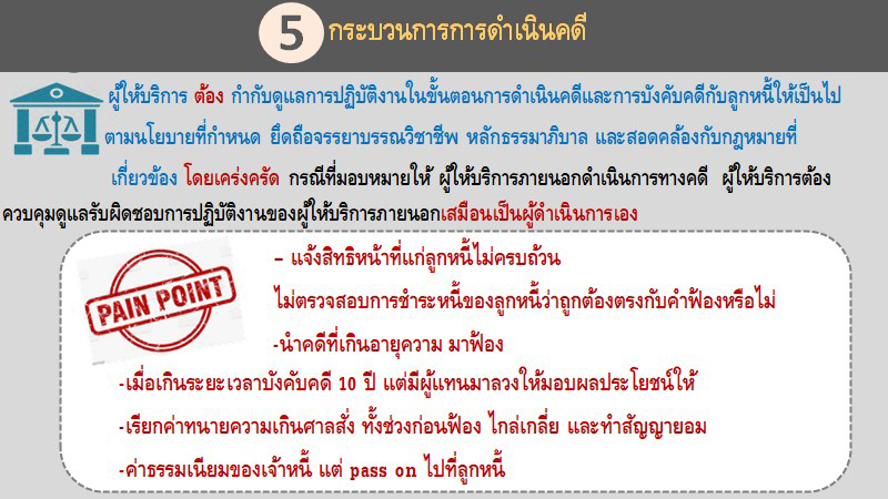 ผู้ให้บริการฯ ต้องกำกับดูแลการปฏิบัติงานในขั้นตอนการดำเนินคดีและการบังคับคดีกับลูกหนี้ให้เป็นไปตามนโยบายที่กำหนด ยึดถือจรรยาบรรณอาชีพ หลักธรรมาภิบาล และสอดคล้องกับกฎหมายที่เกี่ยวข้องโดยเคร่งครัด เช่น ไม่นำคดีที่เกินอายุความมาฟ้อง ไม่เรียกค่าทนายเกินศาลสั่งทั้งช่วงก่อนฟ้อง ไกล่เกลี่ย และทำสัญญายอม เป็นต้น