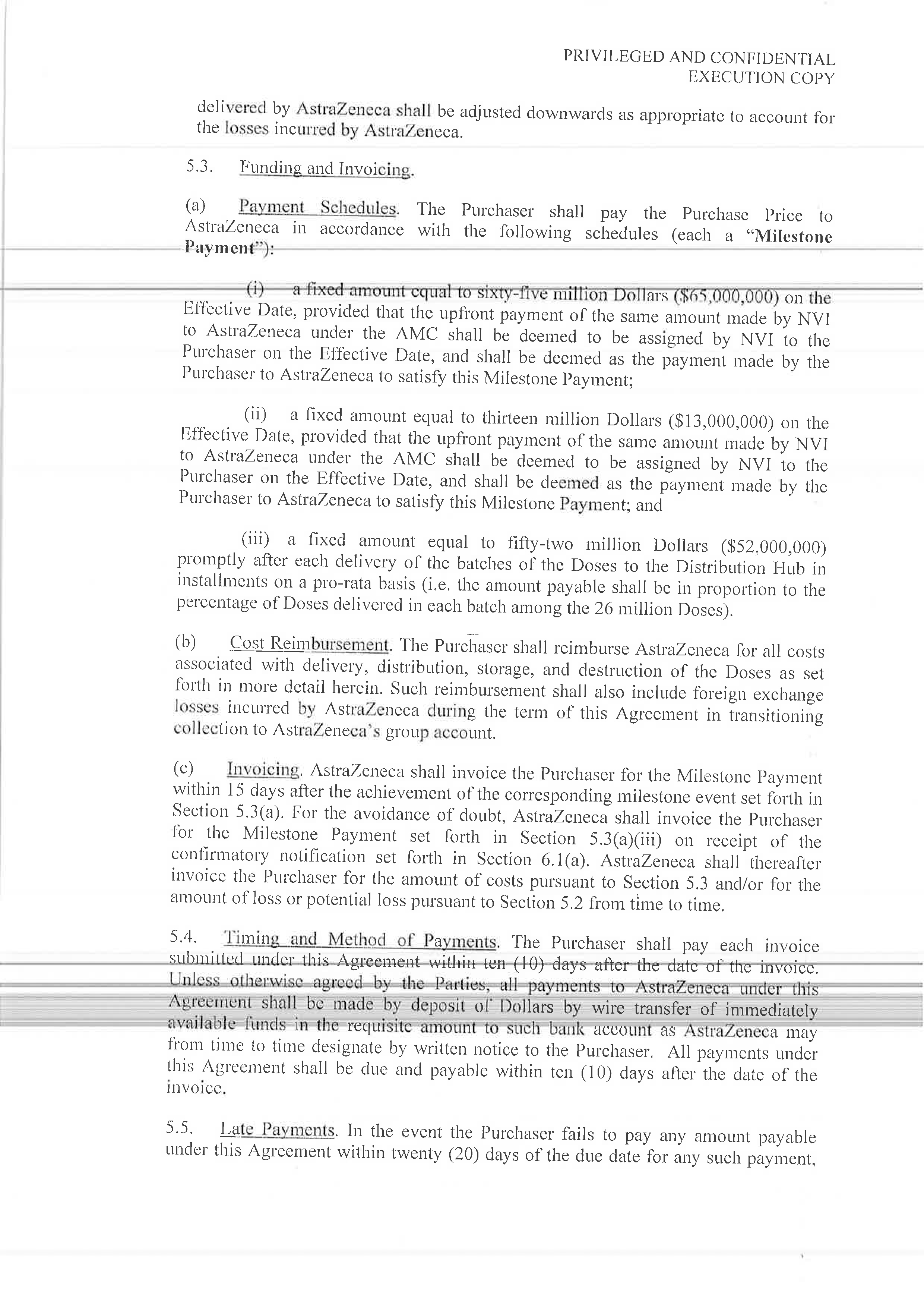 @ช่วงเวลาและวิธีการจ่ายเงิน:ผู้ซื้อจะชำระเงินตามใบแจ้งหนี้แต่ละใบที่ส่งให้ภายใต้ข้อตกลงนี้ โดนจะต้องชำระเงินเป็นเวลา 10 วันหลังจากได้รับใบแจ้งหนี้ โดยจะชำระเงินเป็นเงินดอลลาร์ผ่านทางบัญชีธนาคาร ซึ่งตามแต่ช่วงเวลาทางแอสตร้าเซนเนก้าอาจจะทำลายลักษณ์อักษรเอาไว้ให้กับผู้ซื้อ