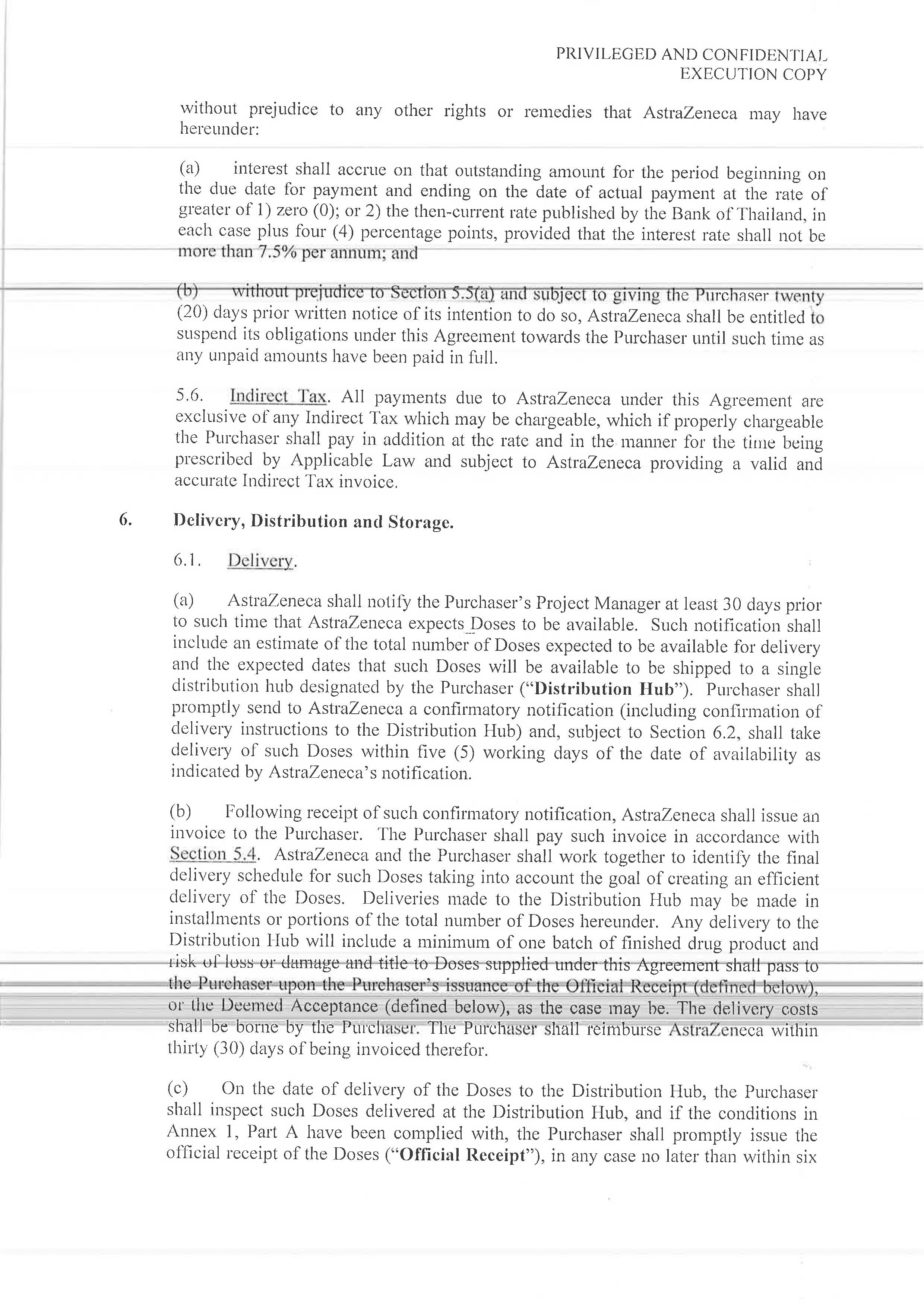 การชำระเงินล่าช้า:ในกรณีที่ผู้ซื้อไม่สามารถจะชำระเงินภายในระยะเวลา 20 วันภายใต้ข้อตกลงนี้ ทางแอสตร้าเซนเนก้าอาจจะดำเนินการใน 2 อย่างดังต่อไปนี้
