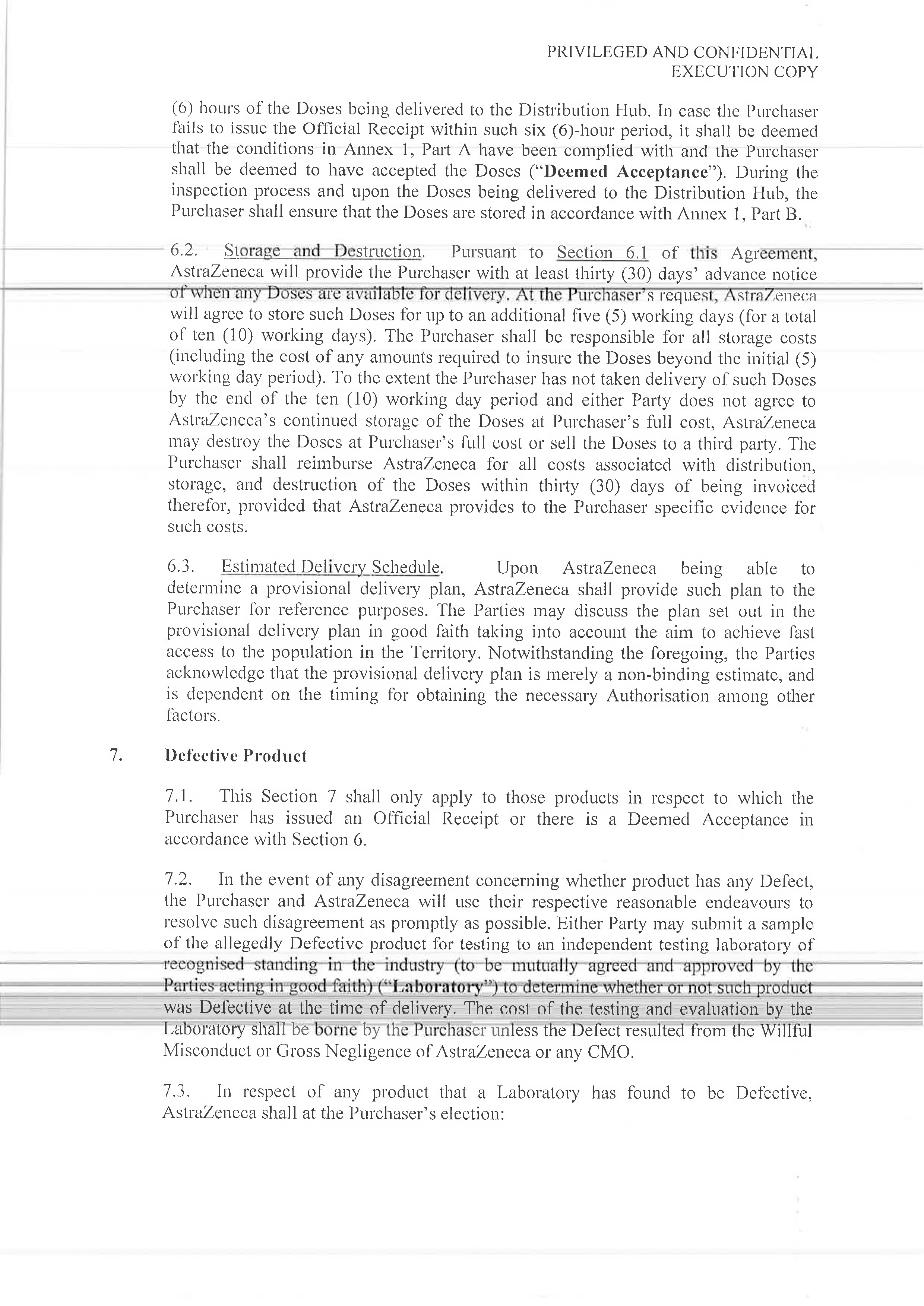 ซึ่งถ้าหากคู่สัญญาในประเทศไทยนั้นไม่สามารถที่จะผลิตวัคซีนได้และส่งผลให้บริษัทแอสตร้าเซนเนก้าไม่สามารถจัดส่งได้ตามข้อกำหนดและเงื่อนไขของข้อตกลงนี้ ทางบริษัทแอสตร้าเซนเนก้าจะใช้ความพยายามอันสมเหตุสมผลที่สุดในการจัดส่งโดสวัคซีนภายใต้ข้อตกลงนี้
