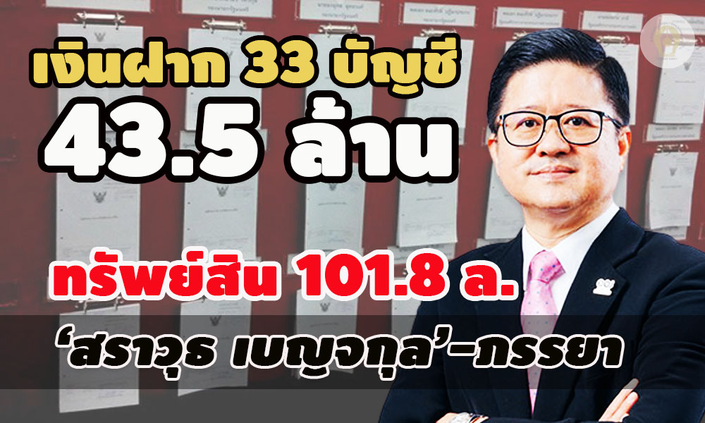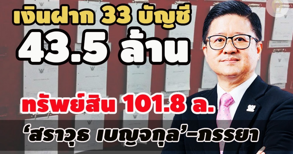 เปิดบัญชีทรัพย์สิน‘สราวุธ เบญจกุล’อดีตเลขาฯ สนง.ศาลยุติธรรม ในหมวกกรรมการ กฟน. 101.8 ล.พร้อมภรรยา เงินฝาก 2 คน 33 บัญชี 43.5 ล. ที่ดิน เงินลงทุน รถยนต์ นาฬิกา ปืน แจ้งรายได้พึงประเมินฯรอบปีภาษีที่ผ่านมา 7,071,936.99 บาท คู่สมรส 2,520,800 บาท
