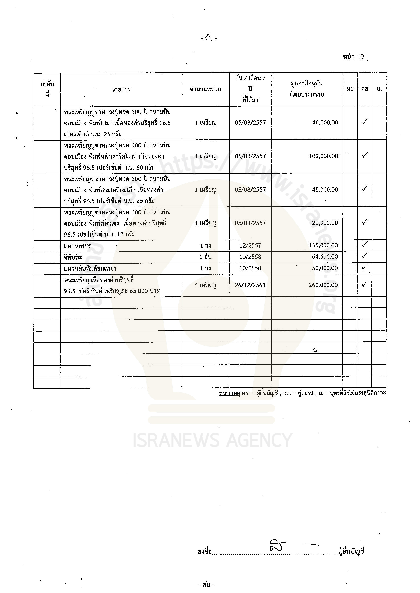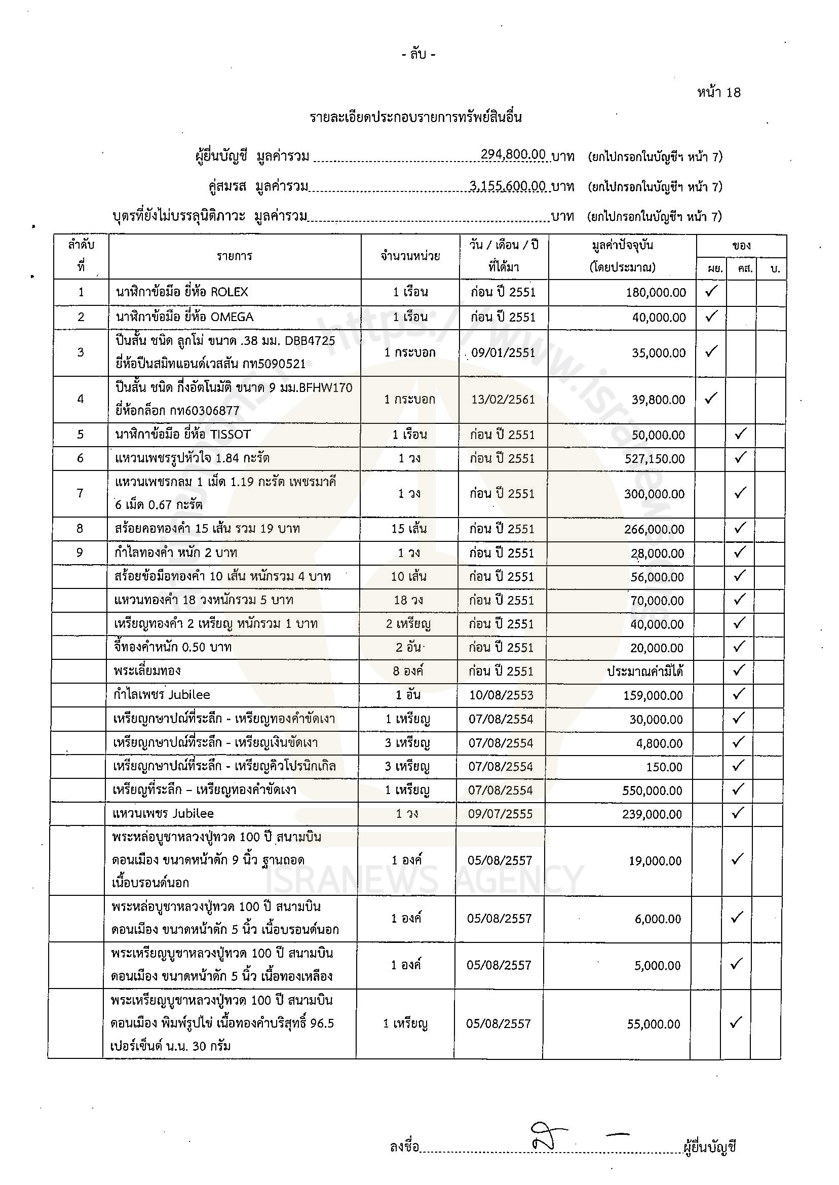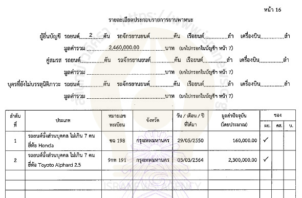 ในจำนวนนี้เป็นเงินฝาก 19 บัญชี 32,918,513.44 บาท เงินลงทุน 3 รายการ 4,190,420.91 บาท ที่ดิน 4 แปลง 2,387,000 บาท โรงเรือนและสิ่งปลูกสร้าง บ้านพัก 1 หลัง 500,000 บาท ยานพาหนะ รถยนต์ 2 คัน ยี่ห้อฮอนด้า และ โตโยตา Alphard 2.5 รวม มูลค่า 2,460,000 บาท สิทธิและสัมปทาน 6,568,435.56 บาท (กรมธรรม์) ทรัพย์สินอื่น 294,800 บาท (นาฬิกา 2 เรือน ปืนสั้น 2 กระบอก) หนี้สิน 1,732,192 บาท