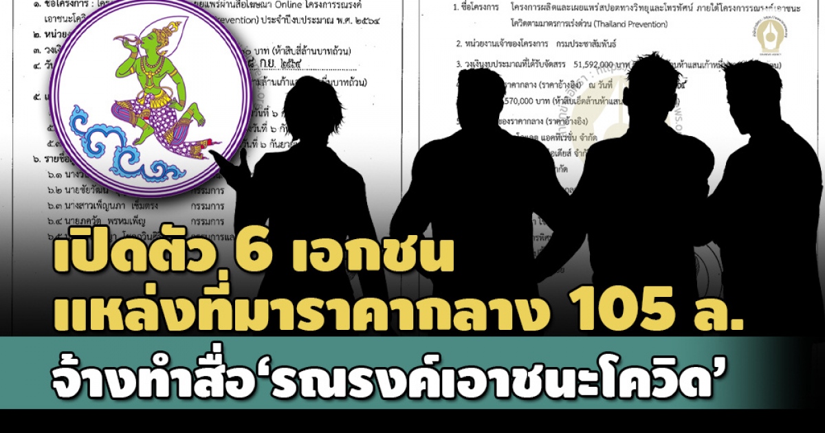 เปิดตัว 6 เอกชน แหล่งที่มาราคากลาง 105 ล้านบาท กรมประชาสัมพันธ์ ใช้อ้างอิงโครงการจ้างทำสื่อ 'รณรงค์เอาชนะโควิด'