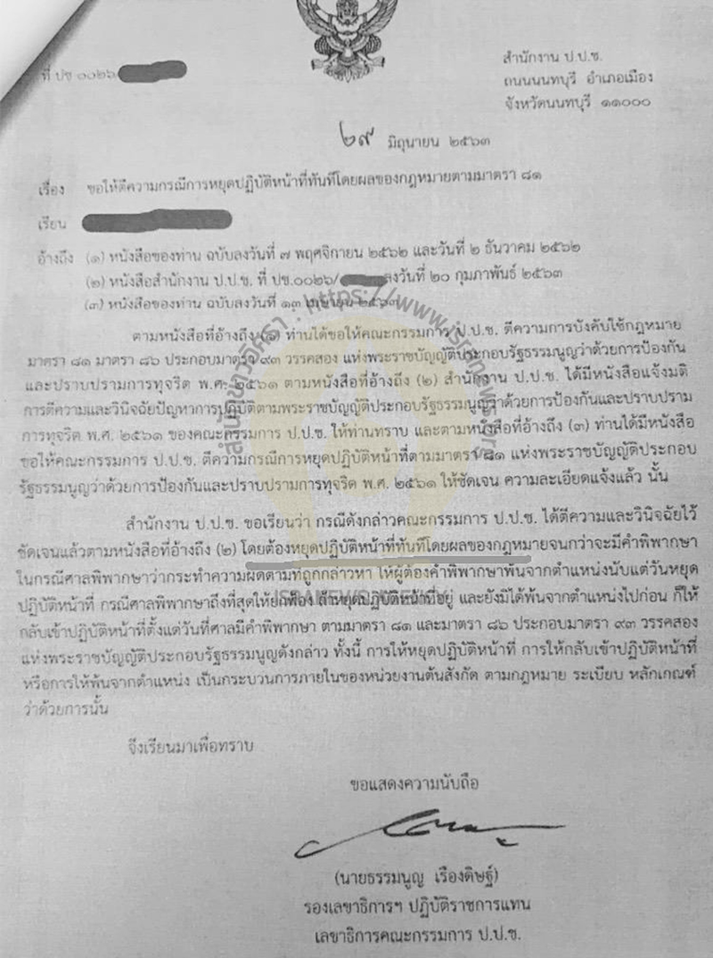 จากการตรวจสอบพบว่า สำนักงานคณะกรรมการป้องกันและปราบปรามการทุจริตแห่งชาติ (ป.ป.ช.) เคยทำหนังสือตอบกลับนักการเมืองคนหนึ่ง ที่ขอให้ตีความกรณีการหยุดปฏิบัติหน้าที่ทันทีโดยผลของกฎหมายตาม มาตรา 81 แห่ง พ.ร.บ.ประกอบรัฐธรรมนูญว่าด้วยการป้องกันและปราบปรามการทุจริต พ.ศ.2561