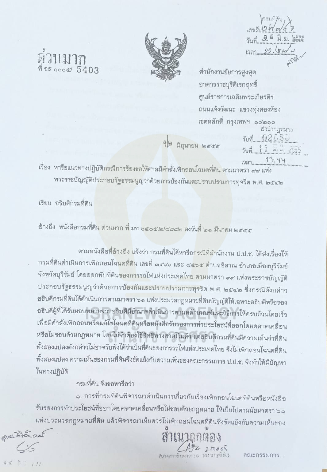 ย้อนกลับไปเมื่อวันที่ 21 มี.ค.2555 กรมที่ดิน ทำหนังสือกรมที่ดิน ด่วนมากที่ มท 0505.2/8982 ลงวันที่ 2 มี.ค.2555 ถึง สำนักงานอัยการสูงสุด ขอหารือกรณี ป.ป.ช. ส่งเรื่องให้กรมที่ดินดำเนินการเพิกถอนโฉนดที่ดินเลขที่ 3466 และ 8564 ต.อิสาณ อ.เมืองบุรีรัมย์ จ.บุรีรัมย์ ซึ่งออกทับที่ดินของ รฟท.
