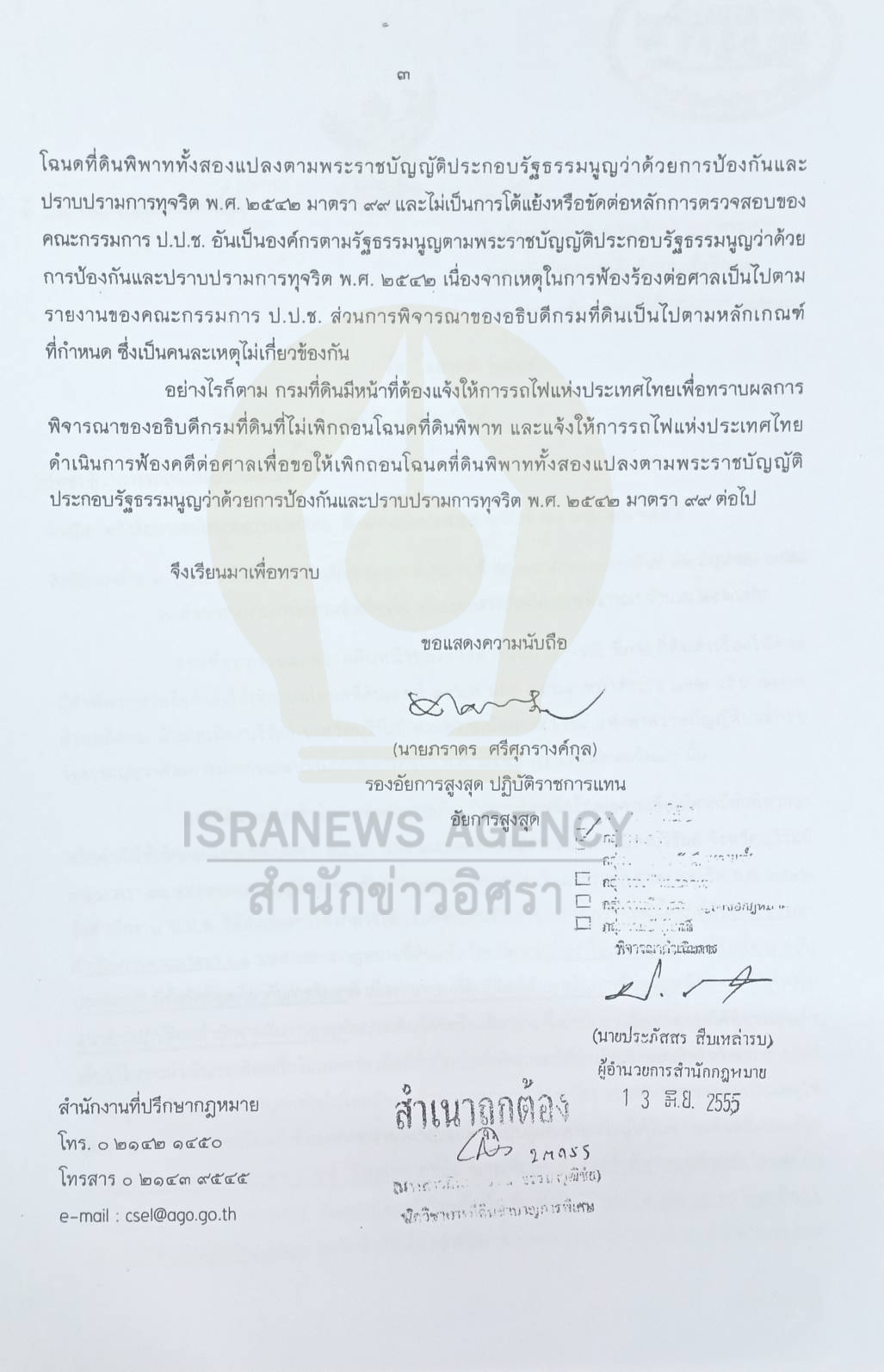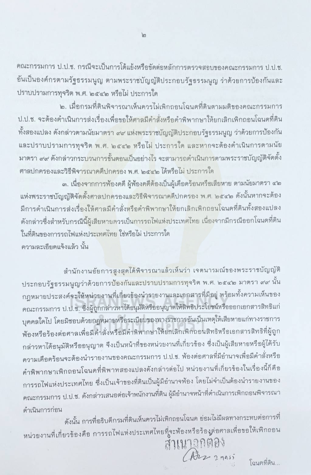 และการที่อธิบดีกรมที่ดินเห็นควรไม่เพิกถอนโฉนดที่ดิน ย่อมไม่มีผลกระทบต่อการที่การรถไฟแห่งประเทศไทยจะฟ้อง หรือร้องต่อศาลเพื่อขอให้เพิกถอนโฉนดที่ดินที่พิพาททั้ง 2 ฉบับ และไม่เป็นการโต้แย้งหรือขัดต่อหลักการตรวจสอบของคณะกรรมการ ป.ป.ช. อันเป็นองค์กรตามรัฐธรรมนูญ ตามพระราชบัญญัติประกอบรัฐธรรมนูญว่าด้วยการป้องกันและปราบปรามการทุจริต พ.ศ.2542 เนื่องจากเหตุในการฟ้องร้องต่อศาลเป็นไปตามรายงานของคณะกรรมการ ป.ป.ช.