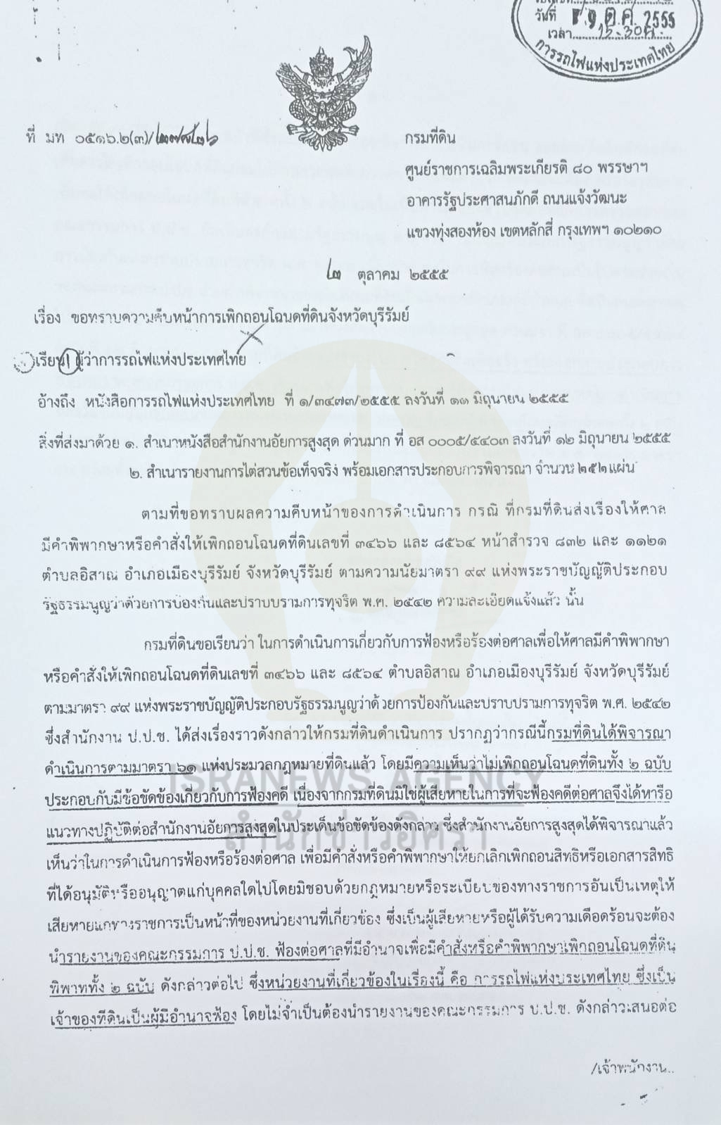 ต่อมา กรมที่ดิน ทำหนังสือที่ มท 0516.2 (3)/27826 เรื่อง ขอทราบความคืบหน้าการเพิกถอนโฉนดที่ดินจังหวัดบุรีรัมย์ ลงวันที่ 2 ต.ค.2555 ลงนามโดย วานิตย์ อินทรักษ์ รองอธิบดีกรมที่ดิน ซึ่งได้รับมอบหมายจากอธิบดีกรมที่ดิน ถึง ผู้ว่าฯรฟท. แจ้งความคืบหน้าการเพิกถอนโฉนดที่ดินเลขที่ 3466 และ 8564 ดังนี้