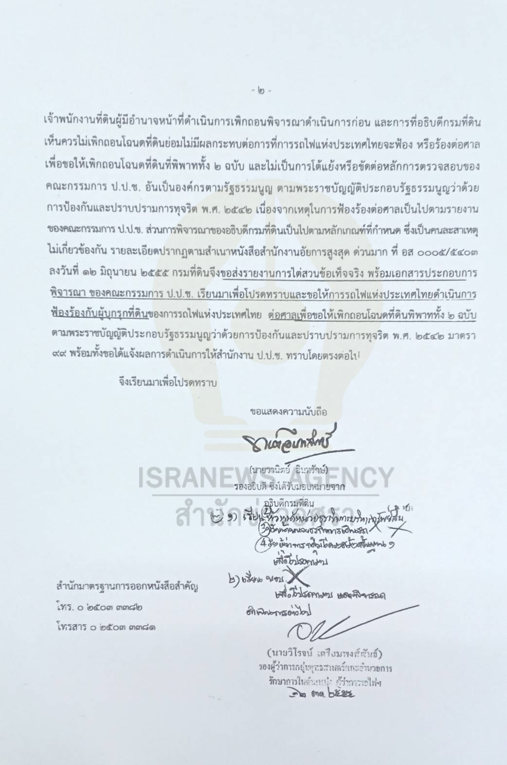 กรมที่ดินจึงขอส่งรายงานการไต่สวนข้อเท็จจริง พร้อมเอกสารประกอบการพิจารณาของคณะกรรมการ ป.ป.ช. เรียนมาเพื่อโปรดทราบ และขอให้การรถไฟแห่งประเทศไทยดำเนินการฟ้องร้องกับผู้บุกรุกที่ดินของการรถไฟแห่งประเทศไทย ต่อศาลเพื่อขอให้เพิกถอนโฉนดที่ดินพิพาททั้ง 2 ฉบับตามพระราชบัญญัติประกอบรัฐธรรมนูญว่าด้วยการป้องกันและปราบปรามการทุจริต พ.ศ.2542 มาตรา 99 พร้อมทั้งขอได้แจ้งผลการดำเนินการให้สำนักงาน ป.ป.ช. ทราบโดยตรงต่อไป