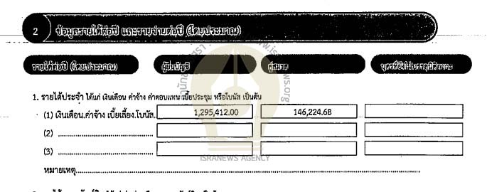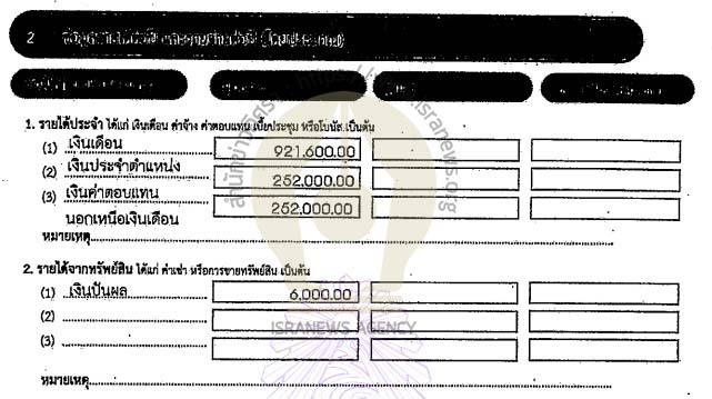 ข้อมูลรายได้และรายจ่ายต่อปี (โดยประมาณ) รายได้ 1,295,412 บาท (ได้ประจำ เงินเดือน ค่าจ้าง เบี้ยเลี้ยง โบนัส) คู่สมรส รายได้ 146,224.68 บาท