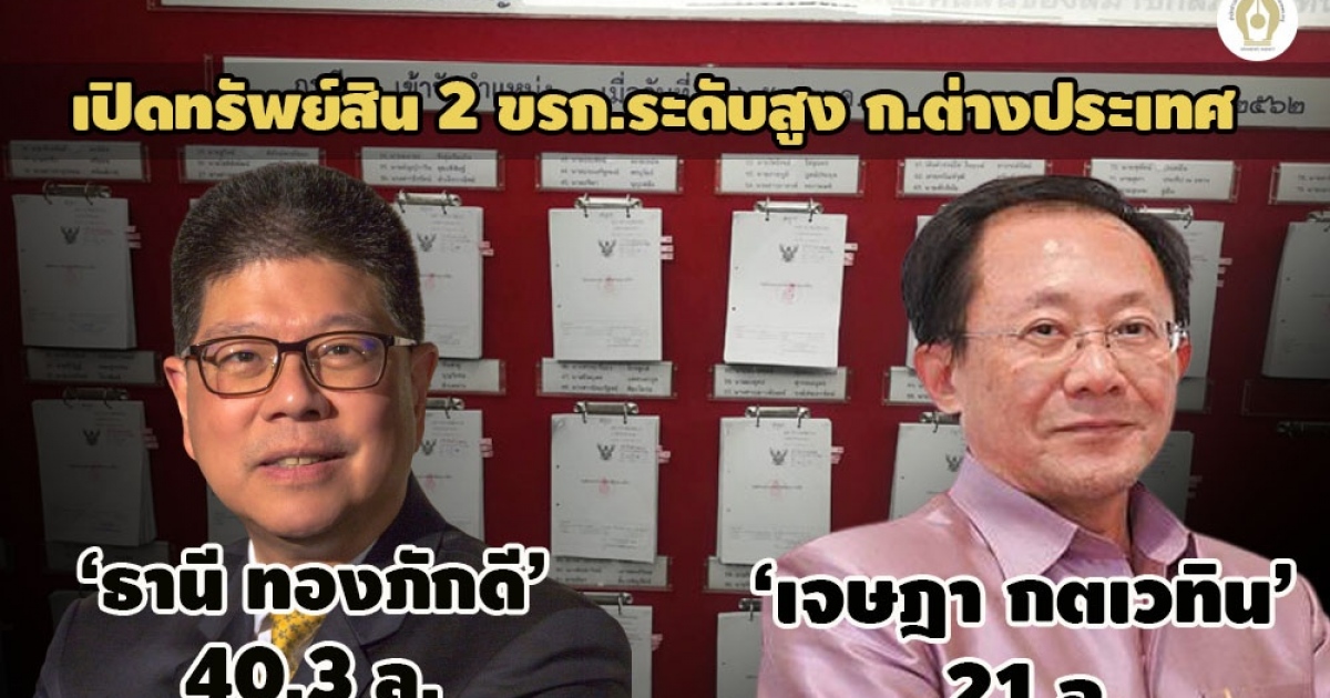 เปิดทรัพย์สิน 2 ขรก.ระดับสูง ก.ต่างประเทศ ‘ธานี ทองภักดี’ปลัดฯ 40 ล. ภรรยา เครื่องเพชร กระเป๋าแอร์เมส 9 ใบ ‘เจษฎา กตเวทิน’ อธิบดีกรมเอเชียใต้ฯ 21 ล. แจ้งรายได้ รายจ่าย เงินได้พึงประเมินภาษี เท่ากันหมด 1,295,412 บาท