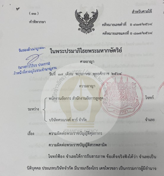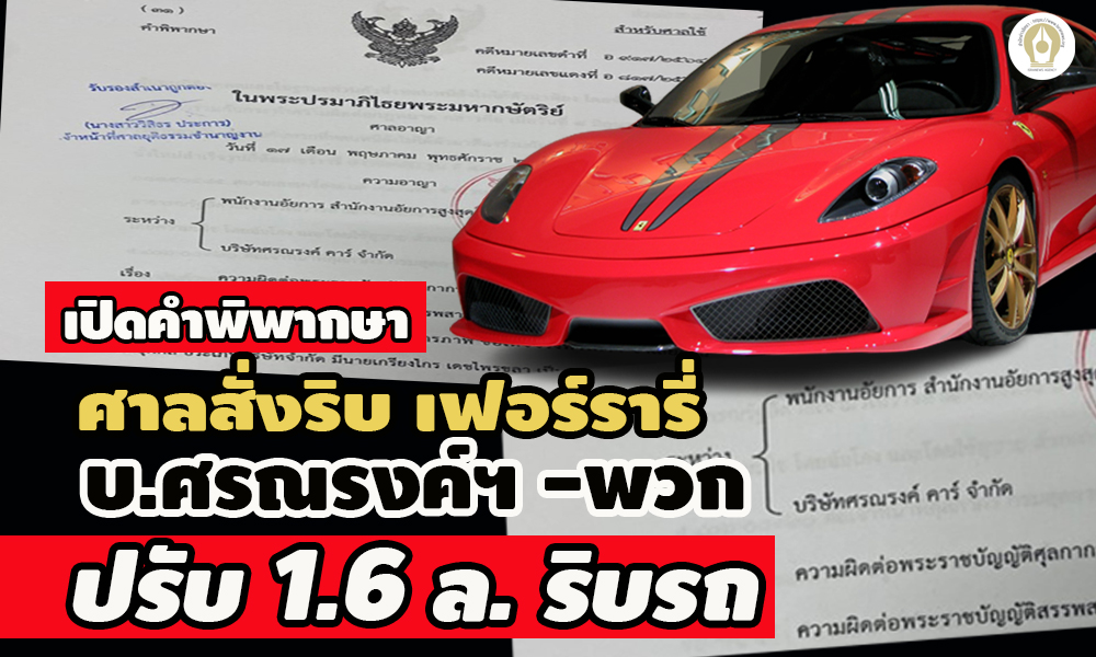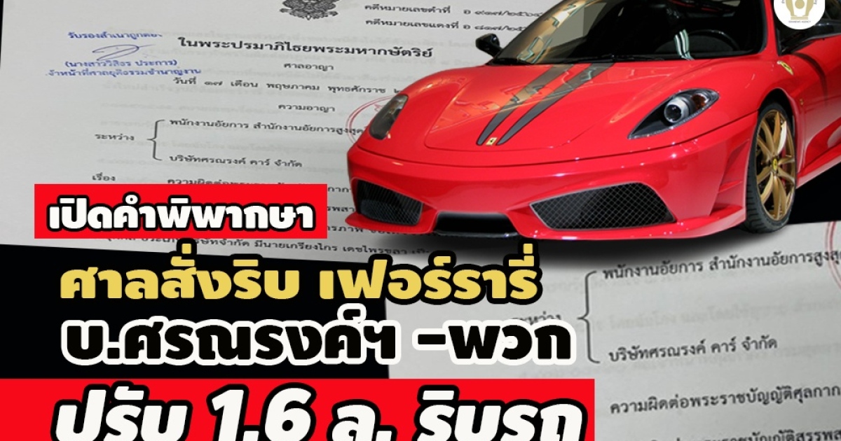 คดีรถหรู! เปิดคำพิพากษา ศาลสั่งริบ เฟอร์รารี่ บ.ศรณรงค์ฯ กับพวกปรับ 1,678,460 บาท แฉนำเข้าจากอิตาลีสำแดงเท็จแค่คันละ 42,600 ดอลลาร์สหรัฐ - 1,296,871.80 บาทจากราคาจริง 101,557.23 ปอน - 5,493,021.43 บาทภาษีอากรที่ต้องชําระจริง 18,017,109.82 บาท อากรขาด 13,763,371.82 บาท สั่งจ่ายเงินสินบนผู้นําจับร้อยละสามสิบของราคารถหรือค่าปรับ จ่ายเงินรางวัล จนท.ชุดจับกุมร้อยละสิบห้าของราคารถ/ค่าปรับ