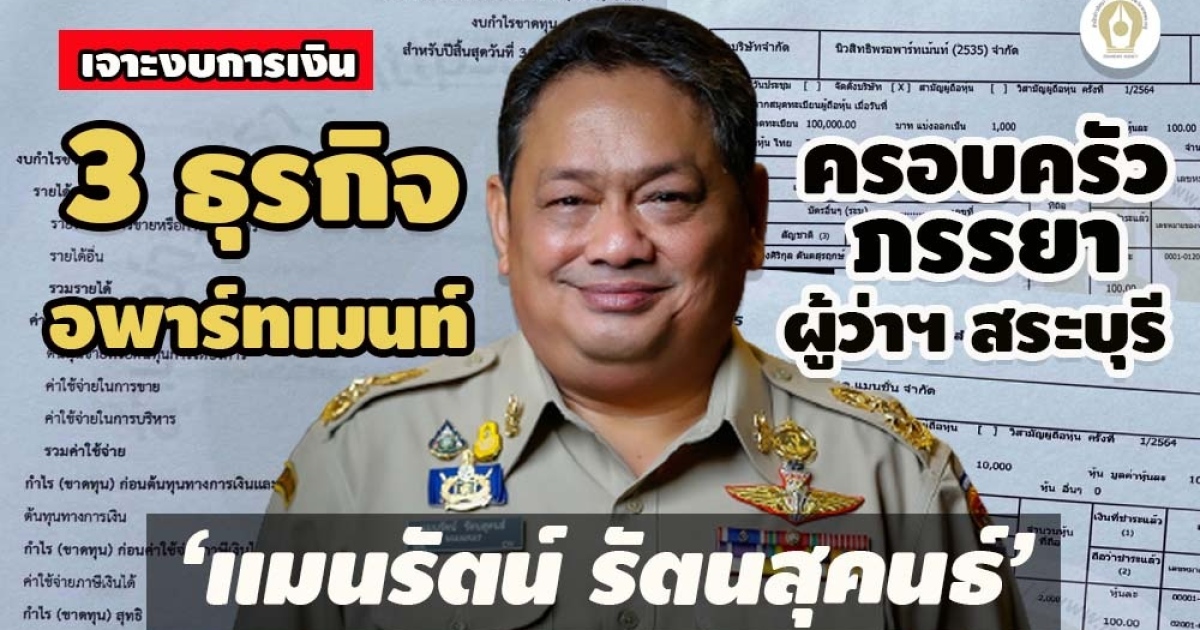 เจาะงบการเงิน 3 ธุรกิจอพาร์ทเมนท์ครอบครัวภรรยา‘แมนรัตน์ รัตนสุคนธ์’ ผู้ว่าฯสระบุรี ไขที่มาเงินฝากในสหกรณ์ออมทรัพย์กระทรวงไทย 2 บัญชี 64.3 ล้าน ผลประกอบการรอบปี 2563 ขาดทุนสุทธิ 2 บริษัท กำไรสุทธิ 1 บริษัท 9.7 แสน เงินฝากรวม 191,030.23 บาท