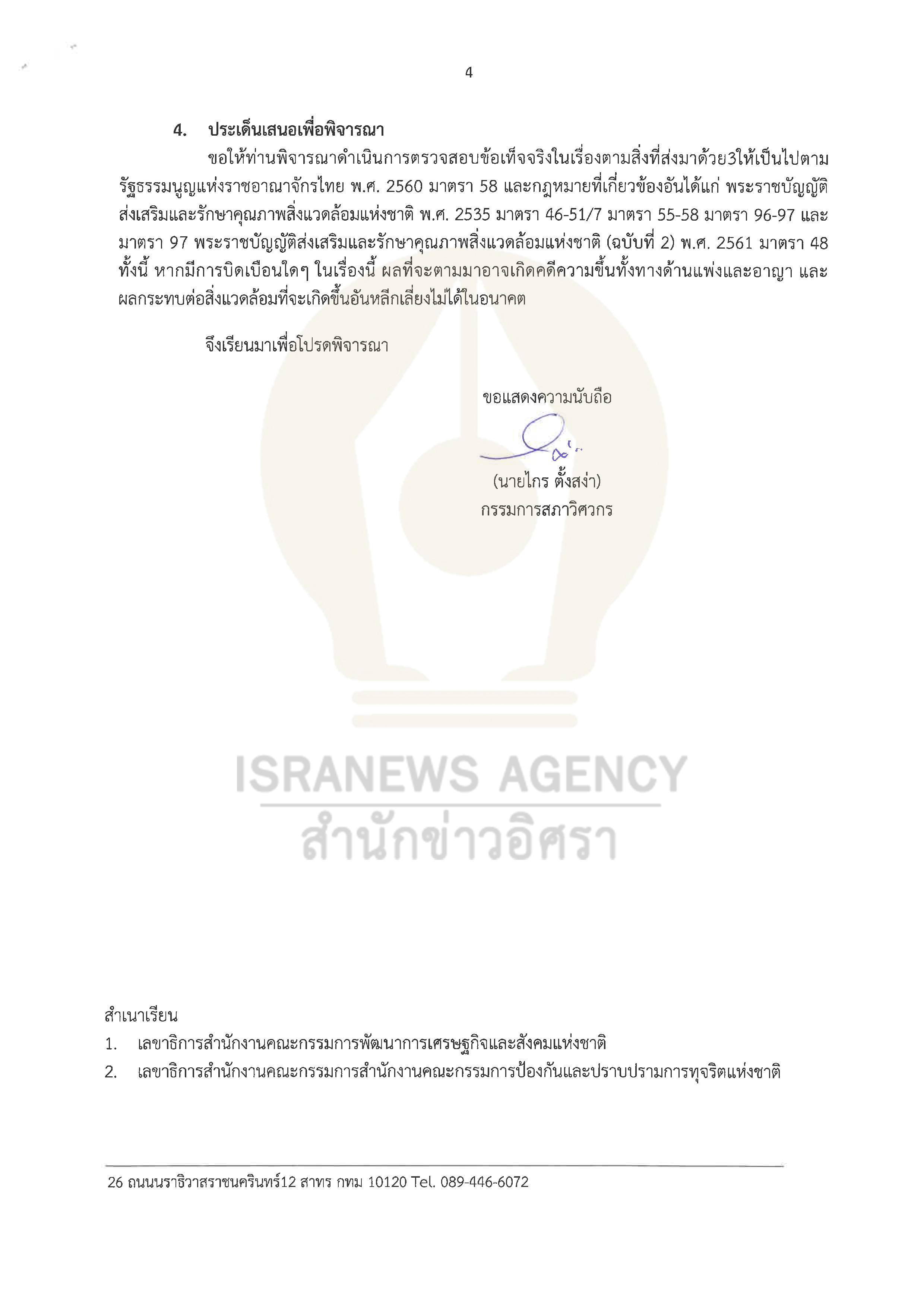 “ขอให้ท่าน (สผ.) พิจารณาดำเนินการตรวจสอบข้อเท็จจริง ให้เป็นไปตามรัฐธรรมนูญแห่งราชอาณาจักรไทย พ.ศ. 2560 มาตรา 58 และกฎหมายที่เกี่ยวข้องอันได้แก่ พ.ร.บ.ส่งเสริมและรักษาคุณภาพสิ่งแวดล้อมแห่งชาติ พ.ศ. 2535 มาตรา 46-51/7 มาตรา 55-58 มาตรา 96-97 และมาตรา 97 พ.ร.บ.ส่งเสริมและรักษาคุณภาพสิ่งแวดล้อมแห่งชาติ (ฉบับที่ 2) พ.ศ. 2561 มาตรา 48