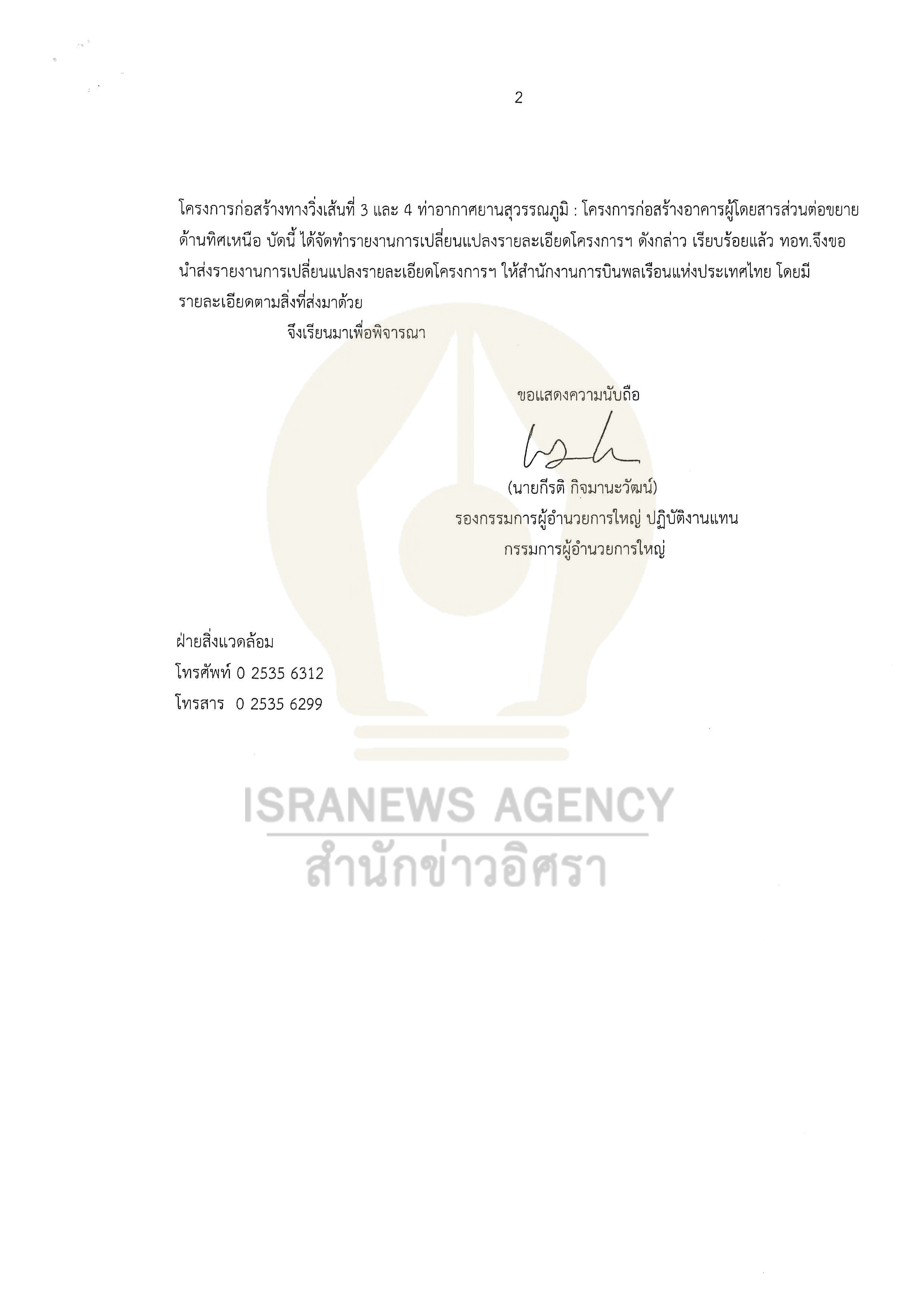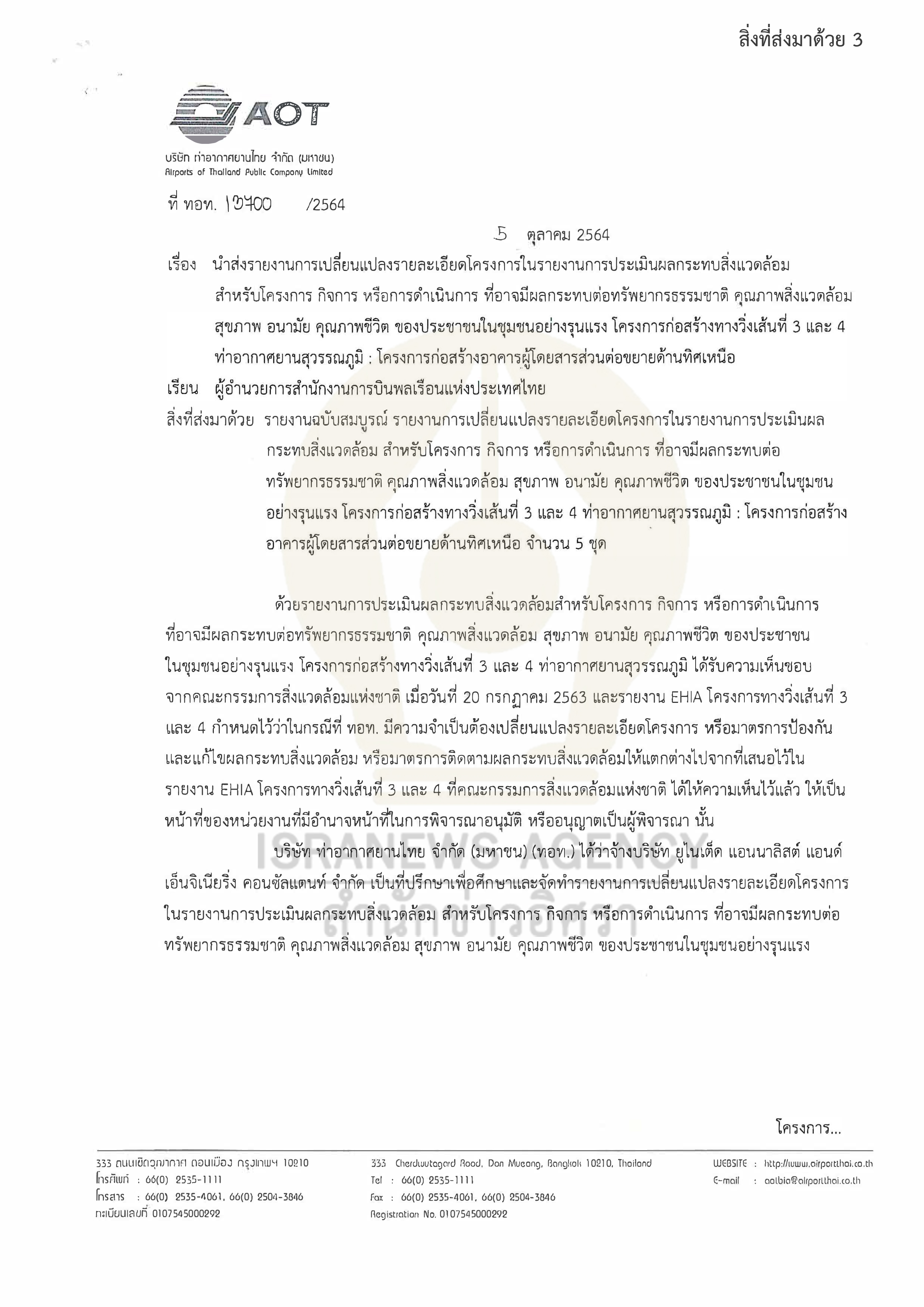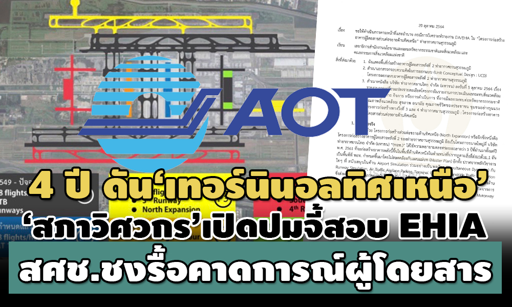 ขณะที่ในเวลาต่อมา กีรติ กิจมานะวัฒน์ รองกรรมการผู้อำนวยการใหญ่ ปฏิบัติหน้าที่แทนกรรมการผู้อำนวยการใหญ่ ทอท. ทำหนังสือที่ ทอท 13700/2565 ลงวันที่ 5 ต.ค.2564 ถึง ผอ.สำนักงานการบินพลเรือนแห่งประเทศไทย แจ้งนำส่งรายงานวิเคราะห์ผลกระทบสิ่งแวดล้อมและสุขภาพ (EIA/EHIA) โครงการก่อสร้าง North Expansion ฉบับปรับปรุง