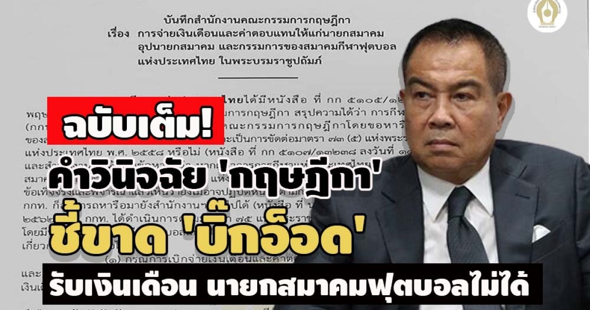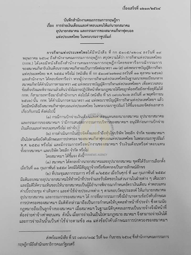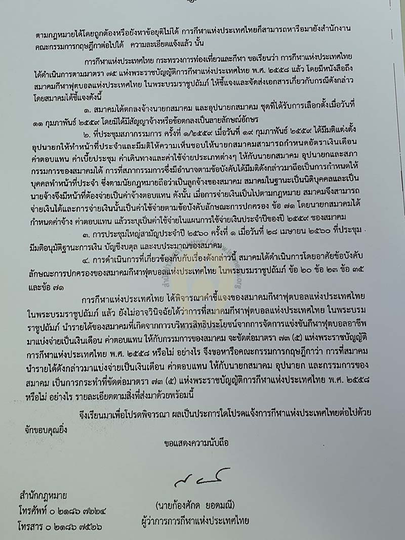 สำนักข่าวอิศรา (www.isranews.org) ตรวจสอบยืนยันข้อมูลด้านเอกสาร พบว่า เกี่ยวกับกรณีนี้ นายก้องศักด ยอดมณี ผู้ว่า กกท. ได้ส่งเรื่องให้กฤษฎีกาตีความเป็นทางการเมื่อวันที่ 19 พฤษภาคม 2564 ที่ผ่านมา ตั้งประเด็นสำคัญในเรื่องการที่สมาคมกีฬาฟุตบอลแห่งประเทศไทย นำรายได้ของสมาคมที่เกิดจากการบริหารสิทธิประโยชน์จากการจัดการแข่งขันกีฬาฟุตบอลอาชีพมาแบ่งจ่ายเป็นเงินเดือน ค่าตอบแทน ให้กับกรรมการของสมาคม จะขัดต่อมาตรา 73 (5) แห่งพระราชบัญญัติการกีฬาแห่งประเทศไทย พ.ศ. 2558 หรือไม่ อย่างไร (ดูรายละเอียดในหนังสือประกอบ)