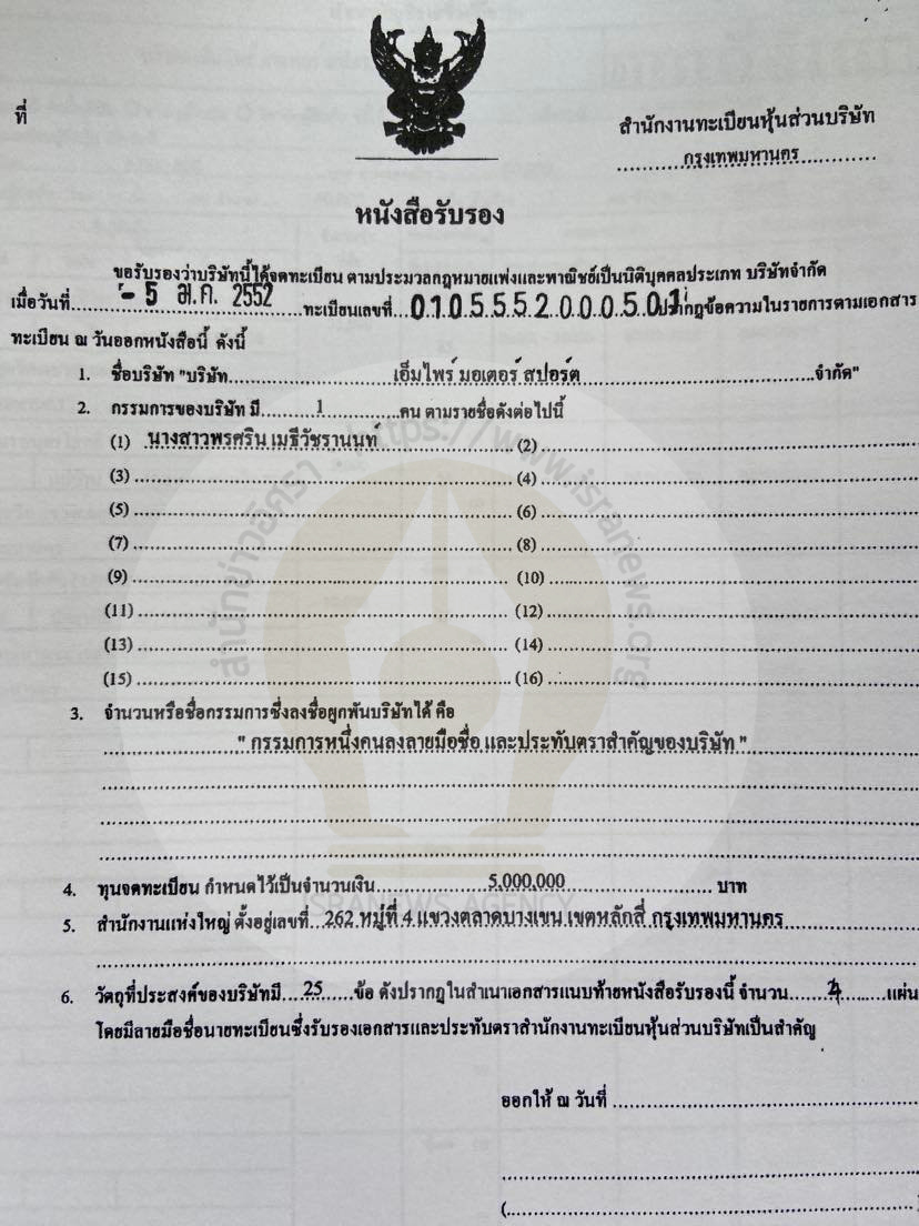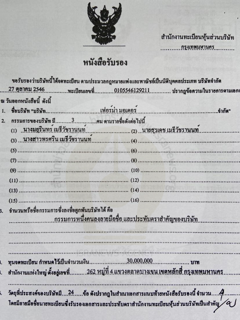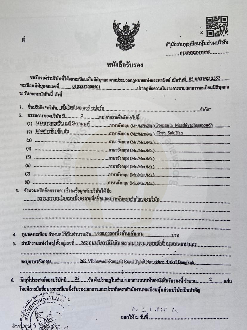 3 พ.ย.2554 กรรมการ 4 คน นายเถาถวัลย์ ศุภวานิช นายเชิญชัย นิยมานุสร นางสาวพรศริน เมธีวัชรานนท์ และ น.ส.ชัน ซุ๊ค ฮัน มีทุนจดทะเบียน 30 ล้านบาท