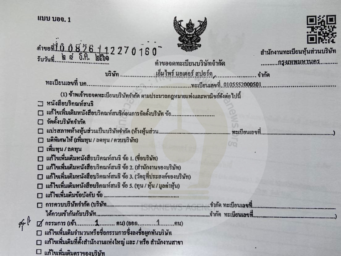 20 ก.ย.2560 บริษัท เอ็มไพร์ มอเตอร์ สปอร์ต จำกัด ยื่นจดทะเบียนเหลือกรรมการ 2 คน นางสาวพรศริน เมธีวัชรานนท์ และ น.ส.ชัน ซุ๊ค ฮัน (นายเชิญชัย นิยมานุสร ออกจากกรรมการ) และลดทุนเหลือ 7,500,000 บาท