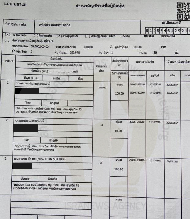 สำนักข่าวอิศราตรวจสอบพบว่า บริษัท เฟอร์ม่า มอเตอร์ จำกัด จดทะเบียนวันที่ 27 ตุลาคม 2546 ทุน 30 ล้านบาท ประกอบการ การขายยานยนต์ใหม่ชนิดรถยนต์นั่งส่วนบุคคลรถกระบะรถตู้ และรถขนาดเล็กที่คล้ายกัน ที่ตั้งเลขที่ 262 หมู่ 4 แขวงตลาดบางเขน เขตหลักสี่ กรุงเทพมหานคร นางมยุรินทร์ เมธีวัชรานนท์ นายพงษ์นรินทร์ เมธีวัชรานนท์ เป็นกรรมการ นางมยุรินทร์ เมธีวัชรานนท์ ถือหุ้นใหญ่ 75,000 หุ้น นายพงษ์นรินทร์ เมธีวัชรานนท์ นายสุรเดช เมธีวัชรานนท์ นางสาวพรศริน เมธีวัชรานนท์ คนละ 60,000 หุ้น ที่เหลืออีก 3 คนๆละ 15,000 หุ้น รวมหุ้นทั้งหมด 300,000 หุ้นมูลค่าหุ้นละ 100 บาท