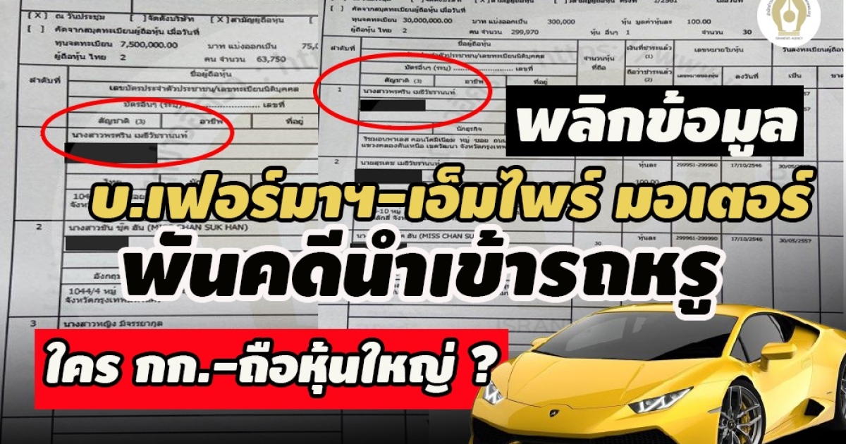 เปิดเอกสารดูข้อมูลจดทะเบียน บ.เฟอร์มาฯ-เอ็มไพร์ มอเตอร์ สปอร์ต 2 นิติบุคคล พัวพันคดีนำเข้ารถยนต์ต่างประเทศในลิสต์ดีเอสไอ พบเปลี่ยนแปลงหลายหน สุดท้าย กรรมการ ผู้ถือหุ้นใหญ่ ชุดเดียวกัน