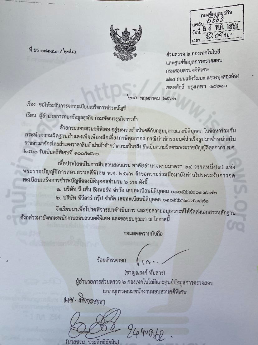 จากการตรวจสอบพบว่า กรมสอบสวนคดีพิเศษ ส่งหนังสือ ขอให้ กรมพัฒนาธุรกิจค้า ระงับการจดทะเบียนเสร็จการชำระบัญชี บริษัท ทีวีอาร์ กรุ๊ป จำกัด ครั้งแรกวันที่ 23 พ.ค.2562 – วันที่ 28 มิ.ย.2564 รวม 6 ครั้ง