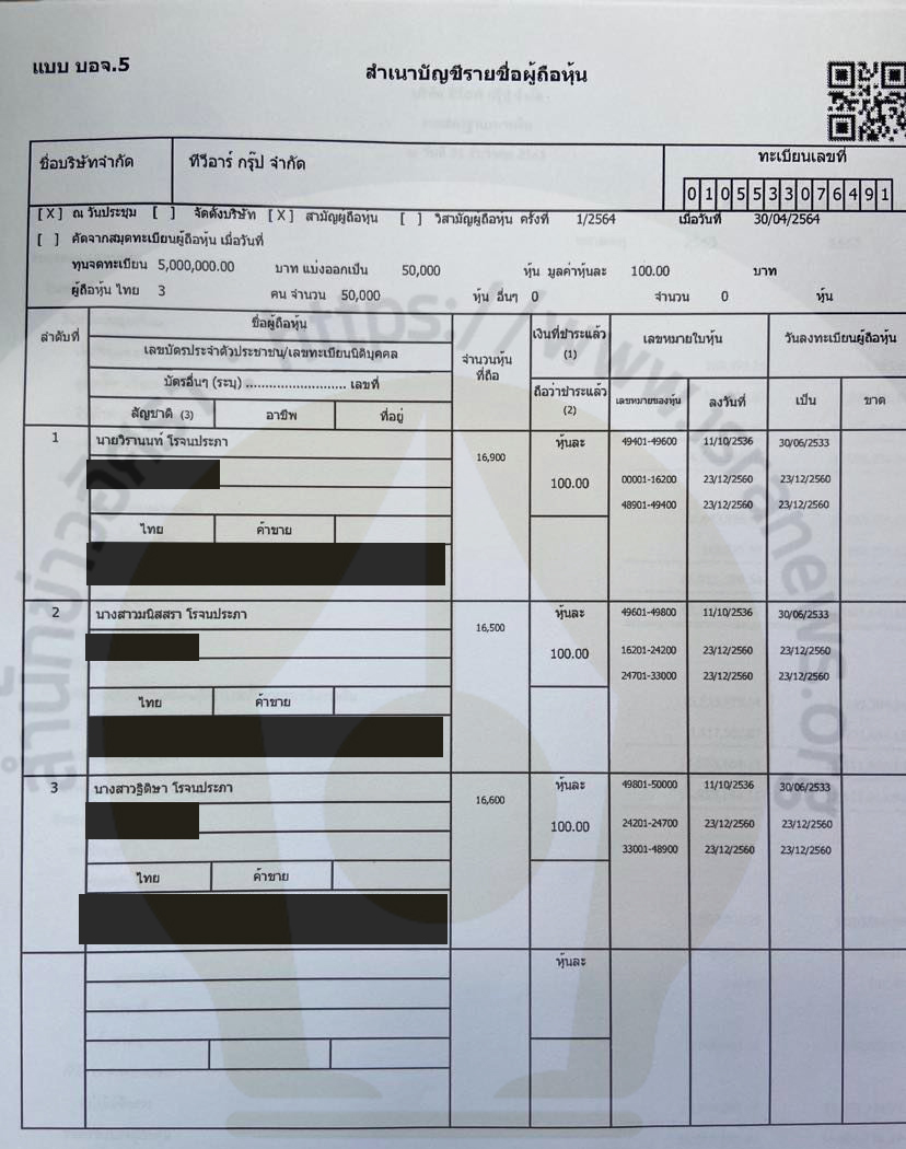 23 ธ.ค.2560 ผู้ถือหุ้น 3 คน นายวิรานนท์ โรจนประภา นางสาว มนิสสรา โรจนประภา นางสาว ฐิติษา โรจนประภา รวม 50,000 หุ้น มูลค่าหุ้นละ 100 บาท ไม่มีการเปลี่ยนแปลงจนถึงล่าสุด