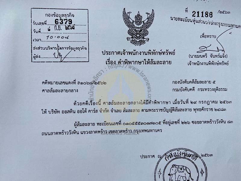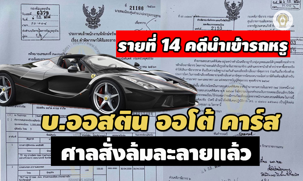 เปิดข้อมูลอีกรายพันคดีนำเข้ารถยนต์ต่างประเทศ บ.ออสติน ออโต้ คาร์ส จดทะเบียนเปลี่ยน กก.4 ครั้ง เชื่อมโยง บ.เดอะ แกลเลอรี่ ออโต้ ฯ ถูกสรรพากร กรมศุลฯสอบภาษีตั้งแต่ปี 2556 ศาลสั่งพิทักษ์ทรัพย์เด็ดขาด สถานะล่าสุดล้มละลาย