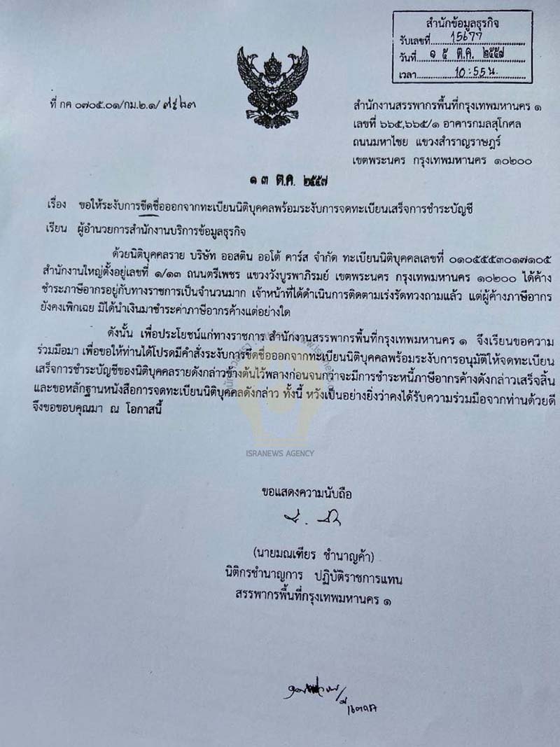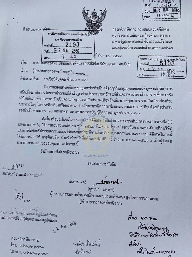 จากการตรวจสอบพบว่า กรมสอบสวนคดีพิเศษ ส่งหนังสือขอให้กรมพัฒนาธุรกิจการค้า ระงับการจดทะเบียนเลิกบริษัท จำนวน 4 ครั้ง ได้แก่ วันที่ 5 ก.ย.2560 , 31 ก.ค.2563 ,7 ม.ค.2564 และ28 มิ.ย.2564